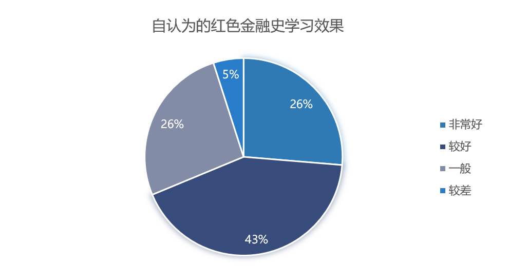 图为受访者自认为的红色金融史学习效果。中国青年网通讯员 王煜诚 摄从受访者自认为的学习效果来看,近半数认为学习效果较好,认为效果一般和非常好的各占26%,由此可见,受访者对学习效果的自我认定存在较大分歧,学习效果的落实有待加强。