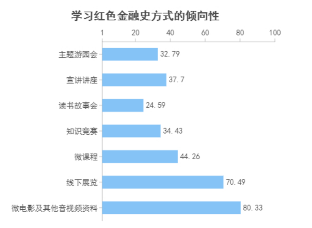 图为学习红色金融史方式的倾向性。中国青年网通讯员 王煜诚 摄调查结果显示,倾向于通过多媒体技术(例如微电影、微课程等)学习红色金融史的受访者高达38.39%;倾向于传统线下展览、宣讲讲座等方式的受访者达34.33% 。总体来说,各种方式均受受访者欢迎,红色金融史的学习倾向呈现多样化趋势,多媒体等新型宣传方式日渐流行。