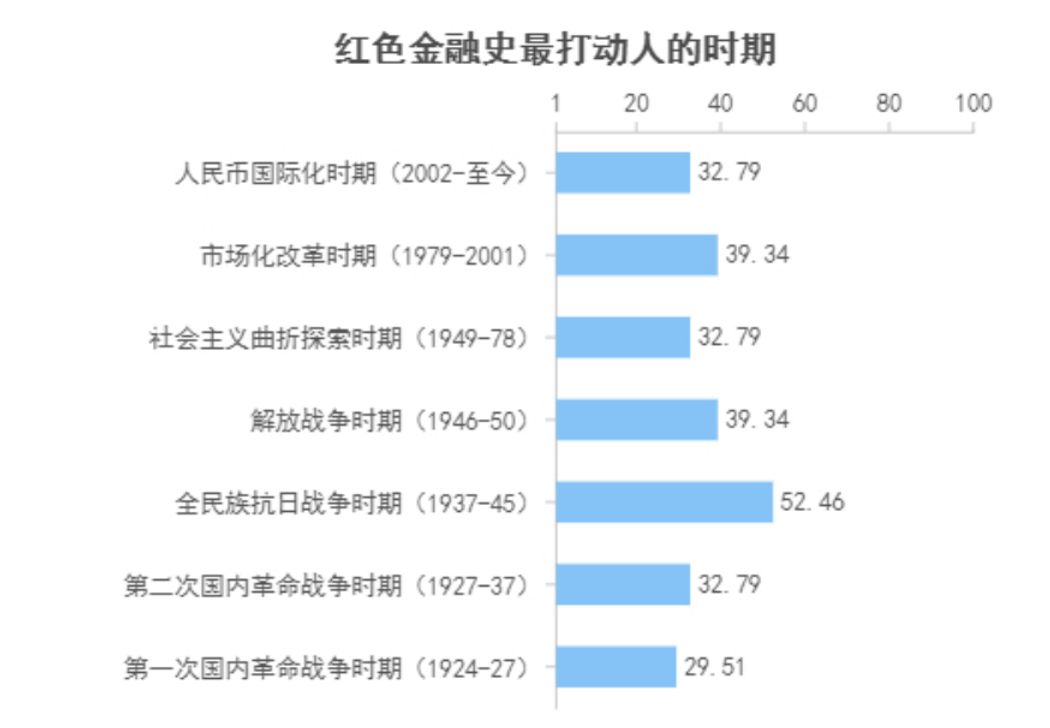 调查结果显示,从第一次国内革命时期到如今接轨世界金融,这漫长的红色金融史中的各个时期都深深地打动了受访者。其中,全民族抗战时期尤为触动受访者的心。