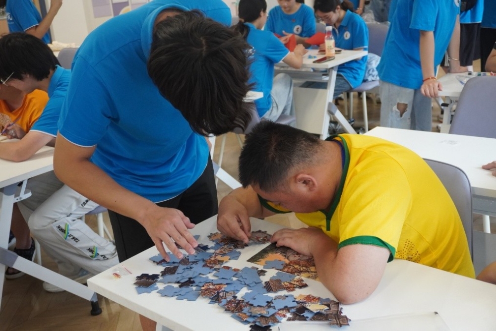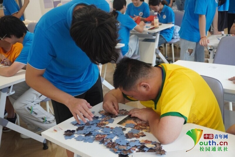 图为实践队员指导残疾朋友拼“中国苏维埃共和国临时中央政府”图案的拼图。倪佳灵 供图