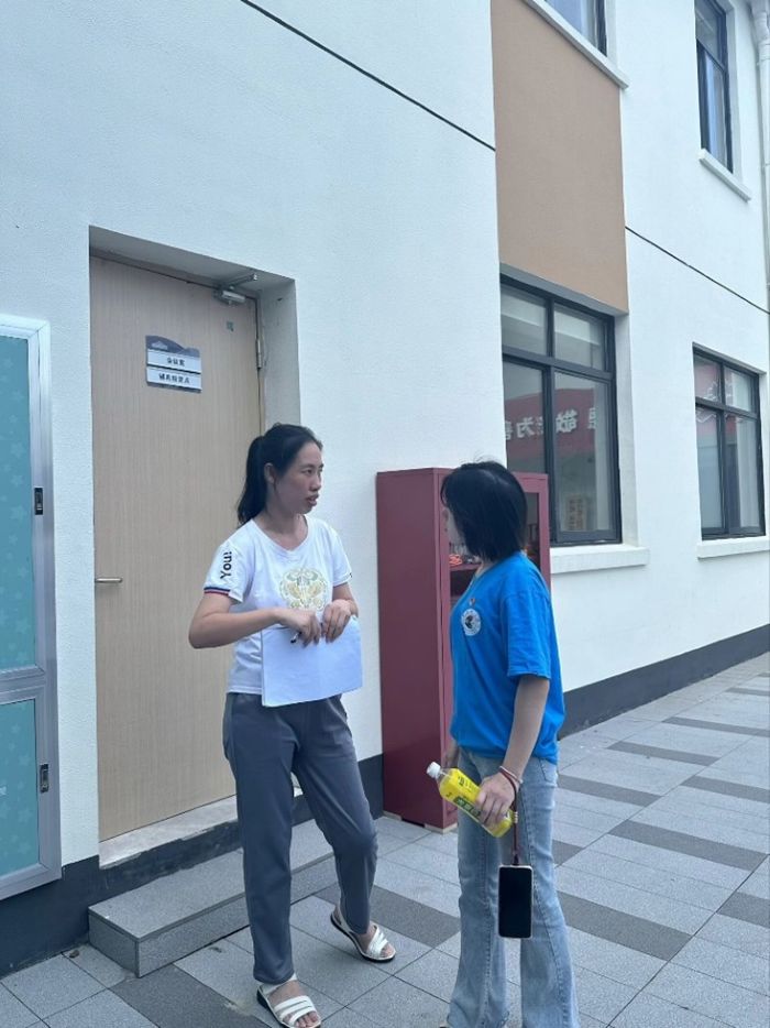 图为实践队员胡子轩与益智园老师沟通,初步了解益智园学员情况。翟涵悦 供图