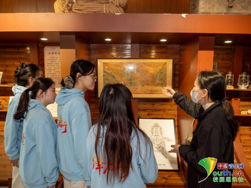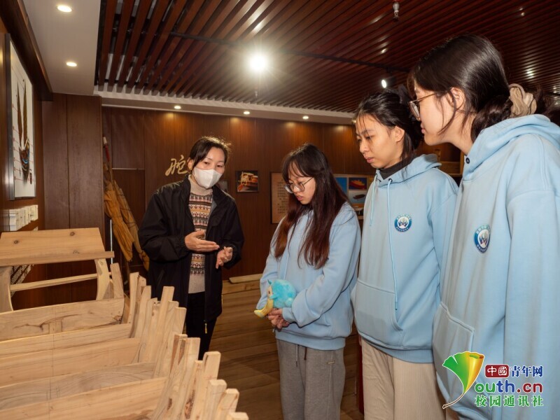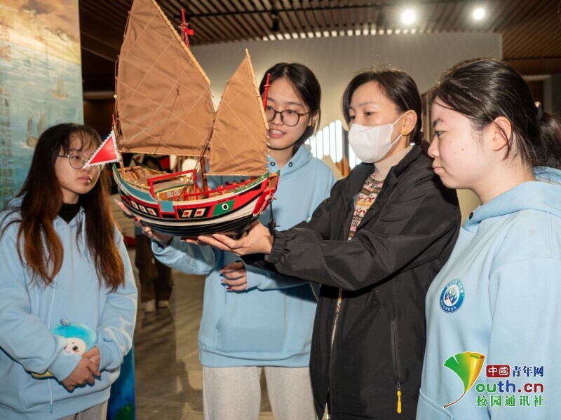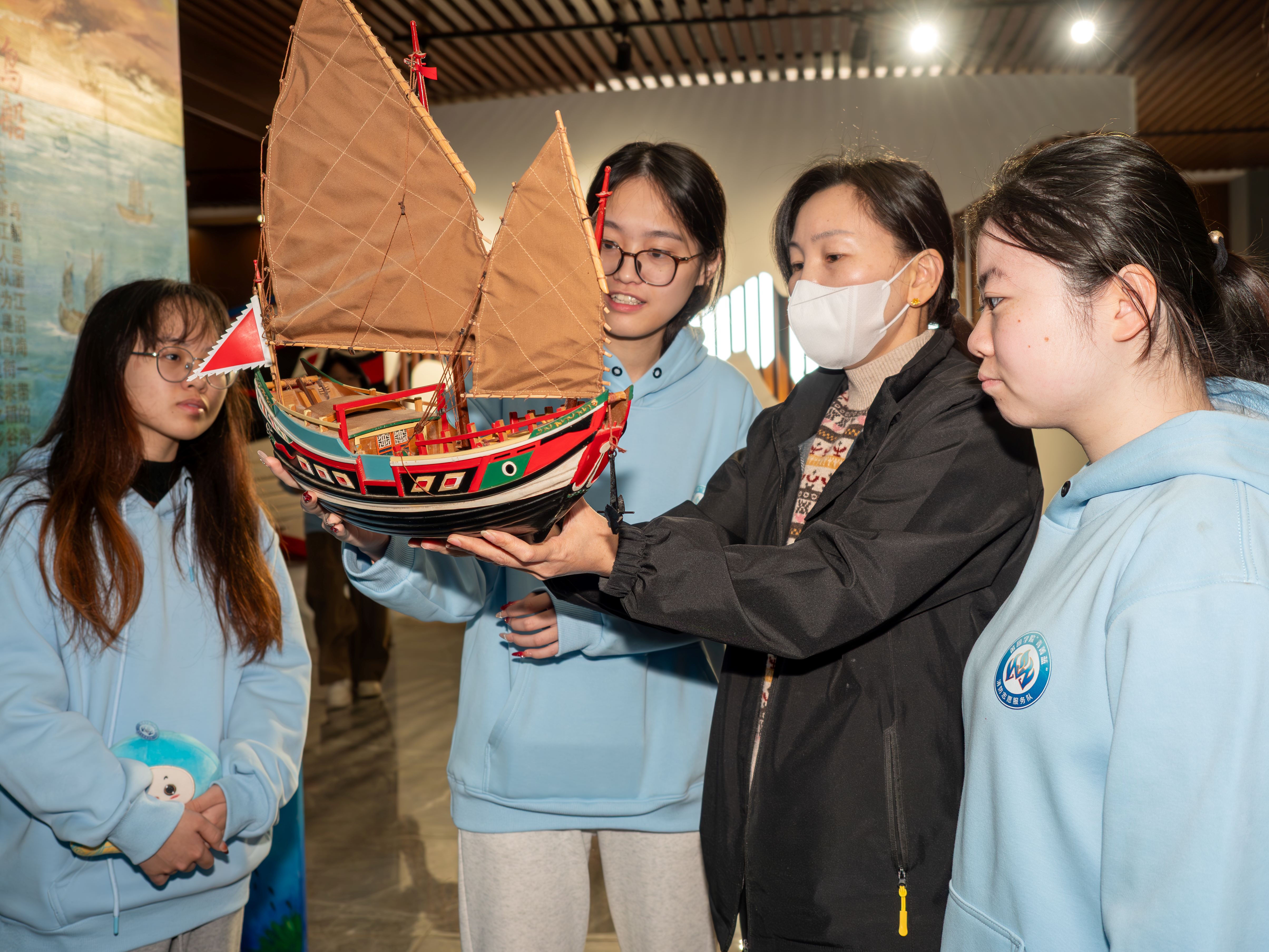 图为讲解员向服务队队员介绍水密隔舱福船制造技艺。郑超鑫 供图