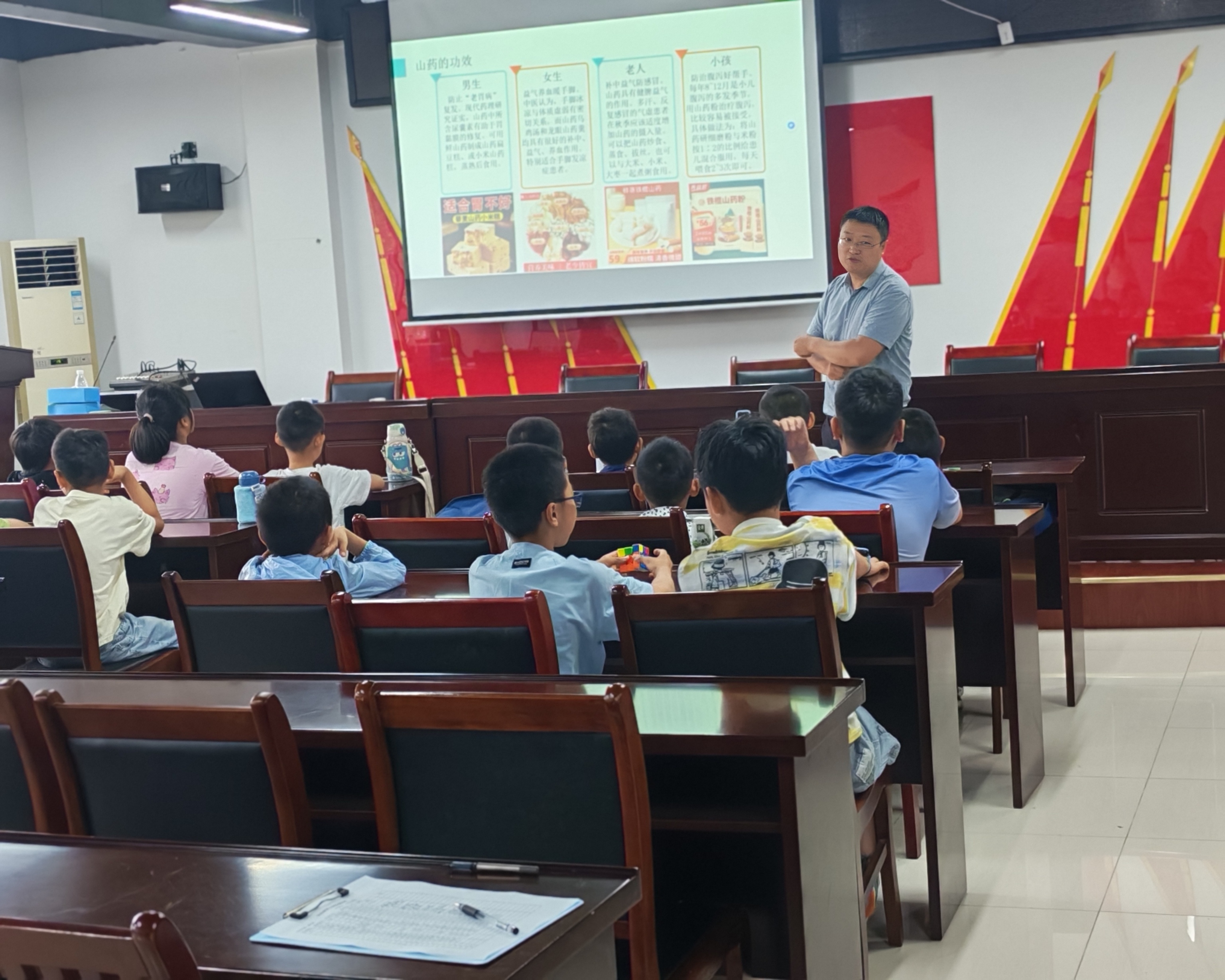 图为徐伟老师在主持三下乡志愿活动开班仪式并讲授中医药知识。 计俊杰 供图