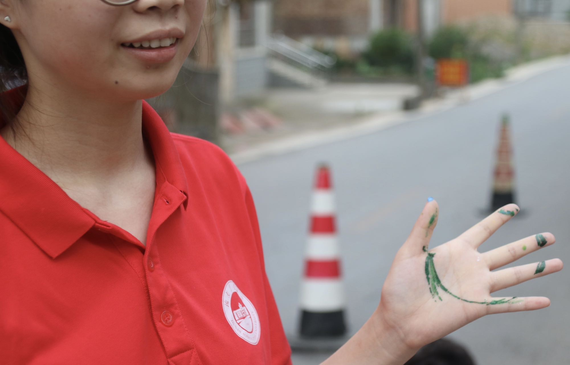 图为工作中团队成员陈依佳被染色的手掌。 中国青年网通讯员 文玟 供图