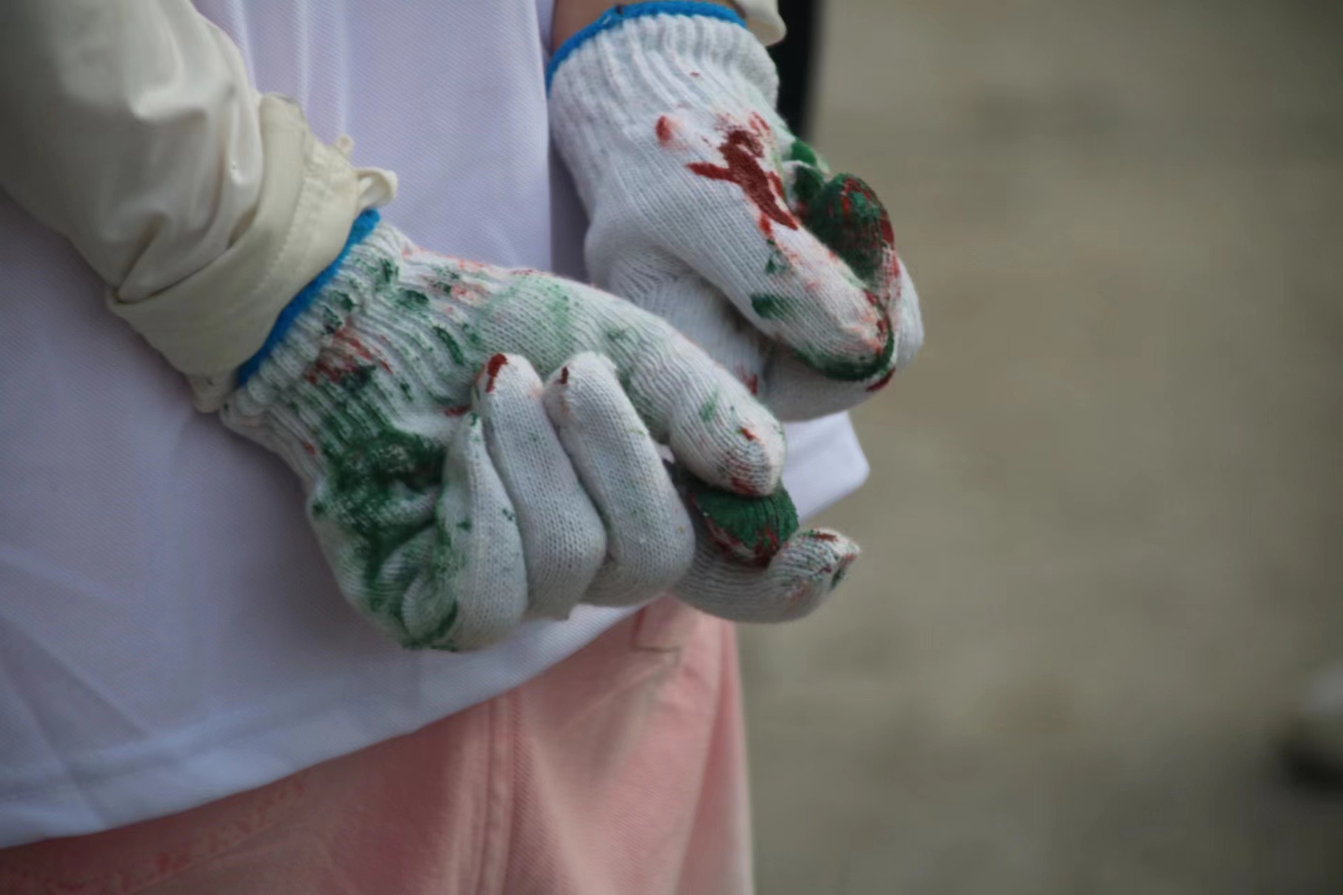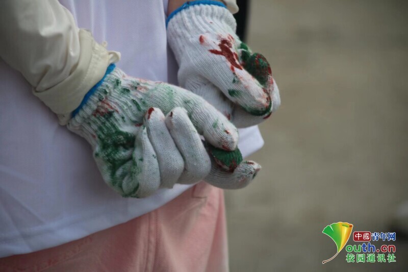 图为团队成员刘宇轩在辛苦墙绘工作中染绿了一双又一双的手套。中国青年网通讯员 陈依佳 供图
