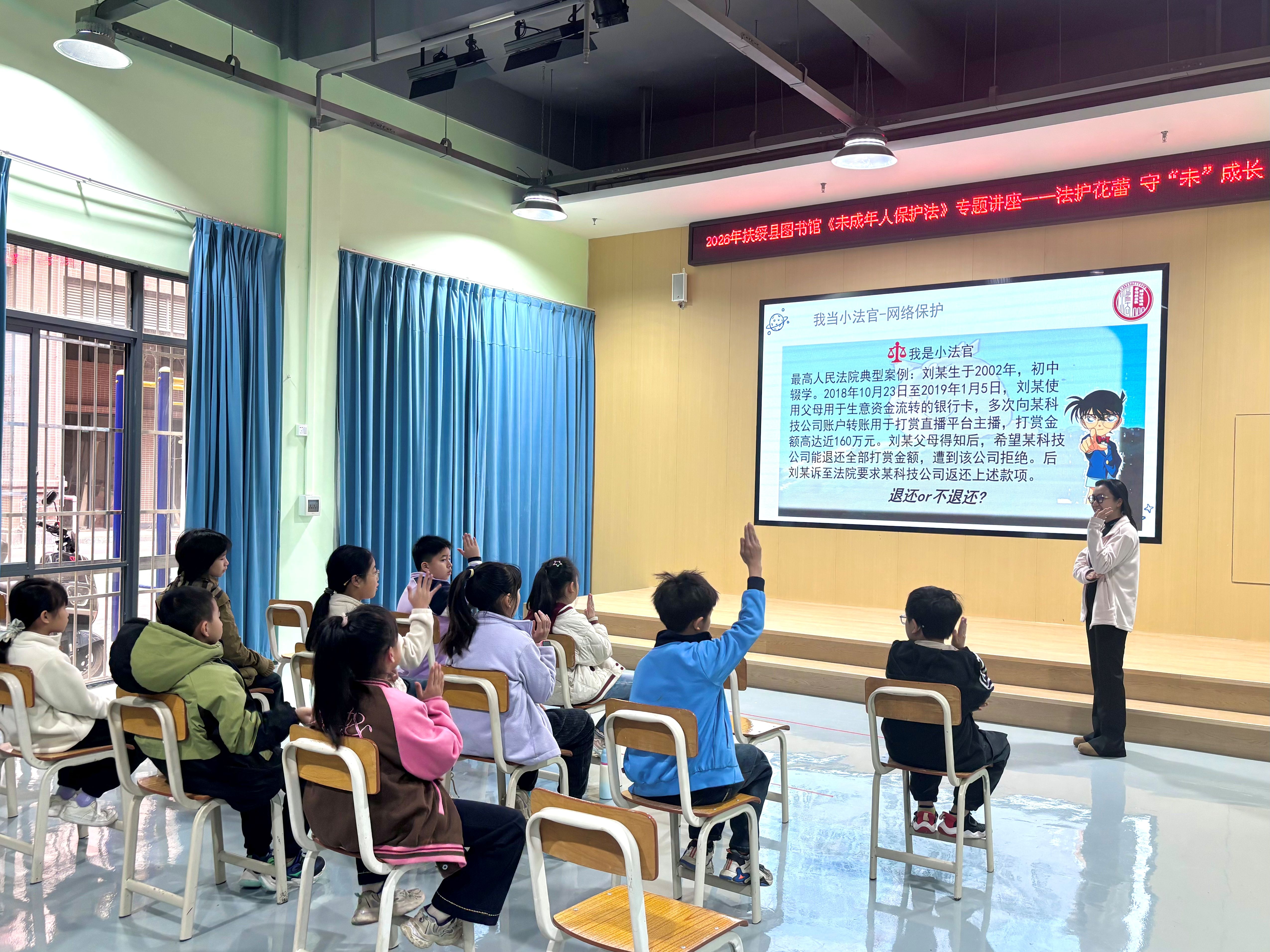 新春返乡,携法护苗。2月7日,广西壮族自治区崇左市扶绥县图书馆内,一场以“法护花蕾,守‘未’成长”为主题的“未成年人保护法”宣讲活动如期开展,为新春氛围增添了一抹法治亮色。来自湘潭大学的“送法到万家”普法宣讲员秉持“返家乡”实践初心,结合自身专业所学,为现场的孩子们带来了一堂生动的法治宣讲课。