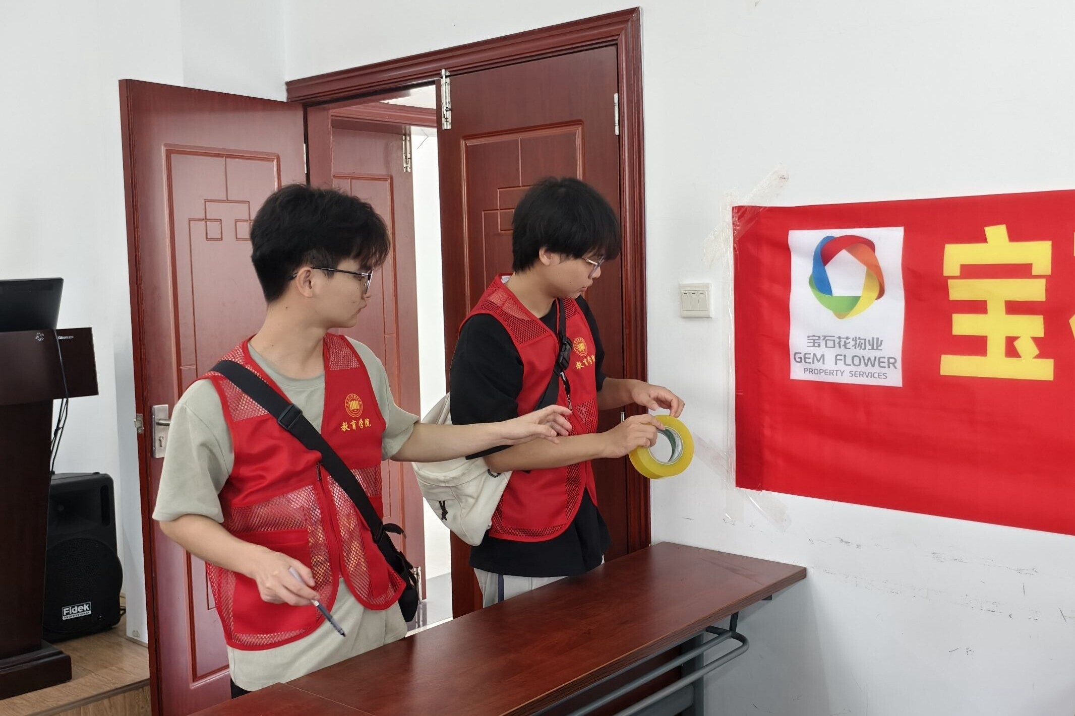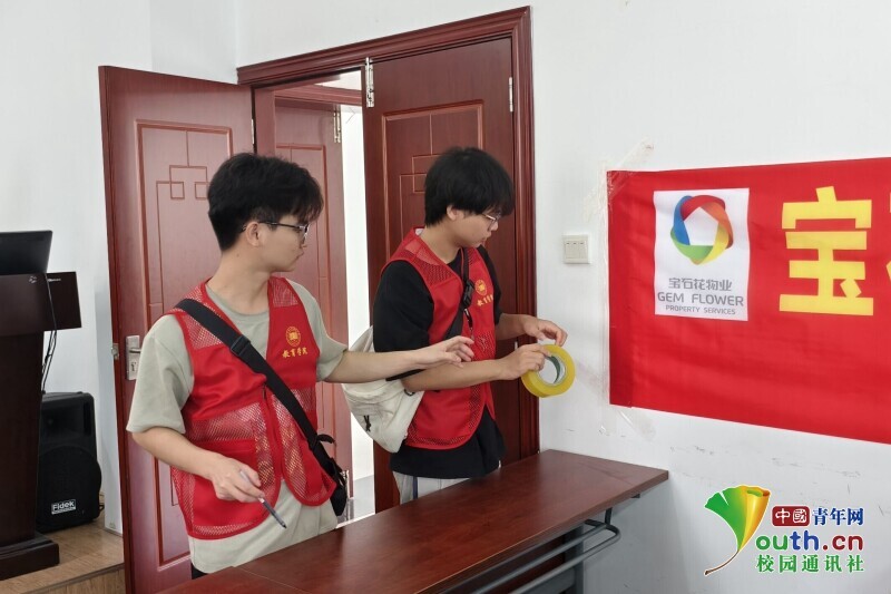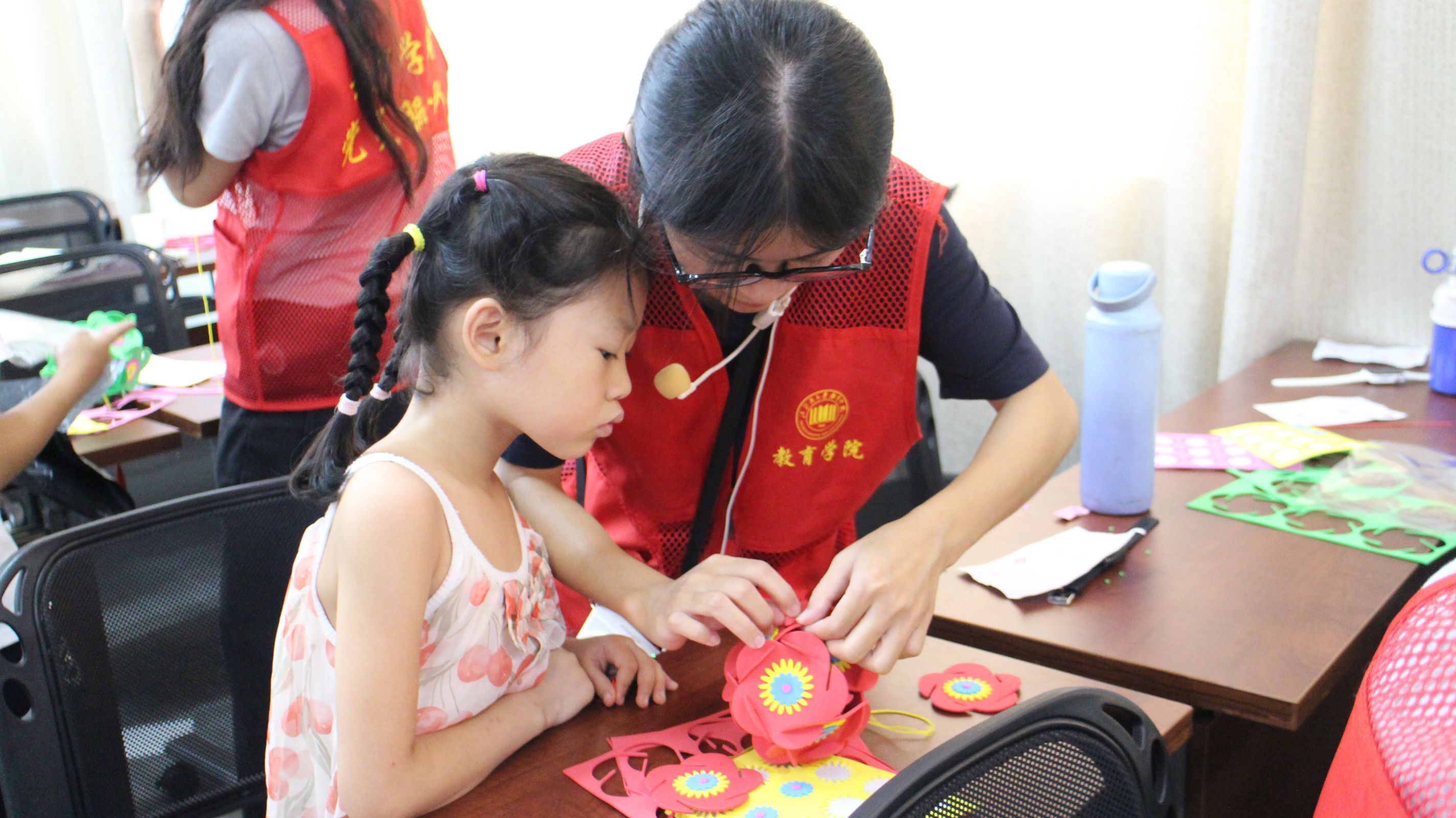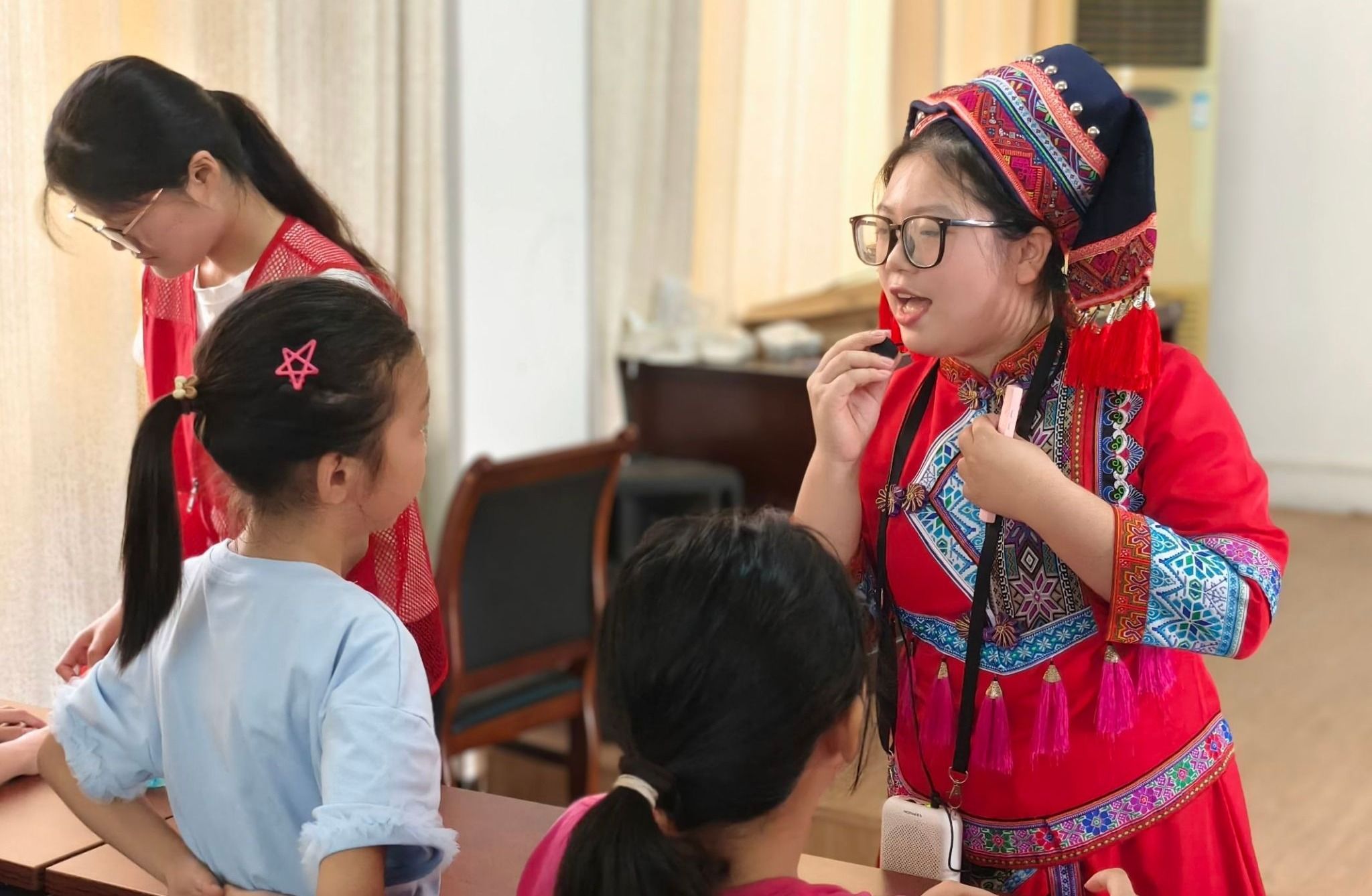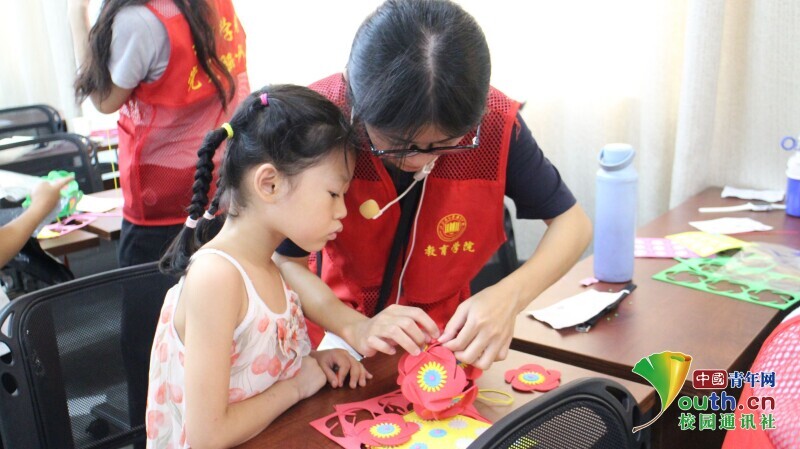 图为实践团成员帮助社区小学生制作壮族绣球。闫雪欣 供图