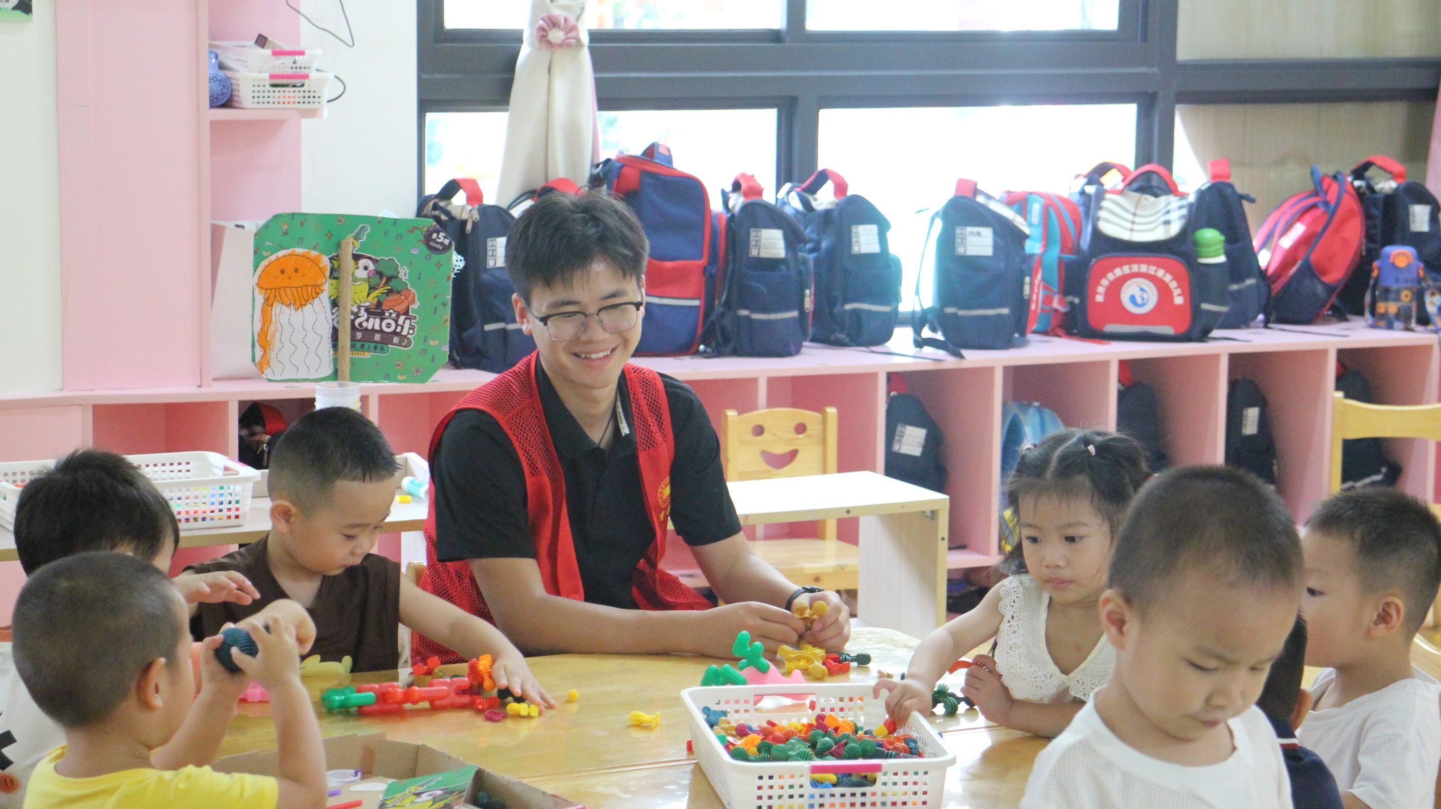 图为实践团成员和幼儿园小朋友一起进行积木建构。闫雪欣 供图