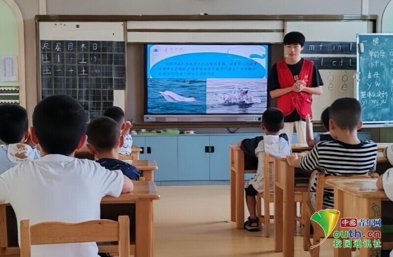 图为实践团成员向幼儿园小朋友介绍钦州中华白海豚。闫雪欣 供图
