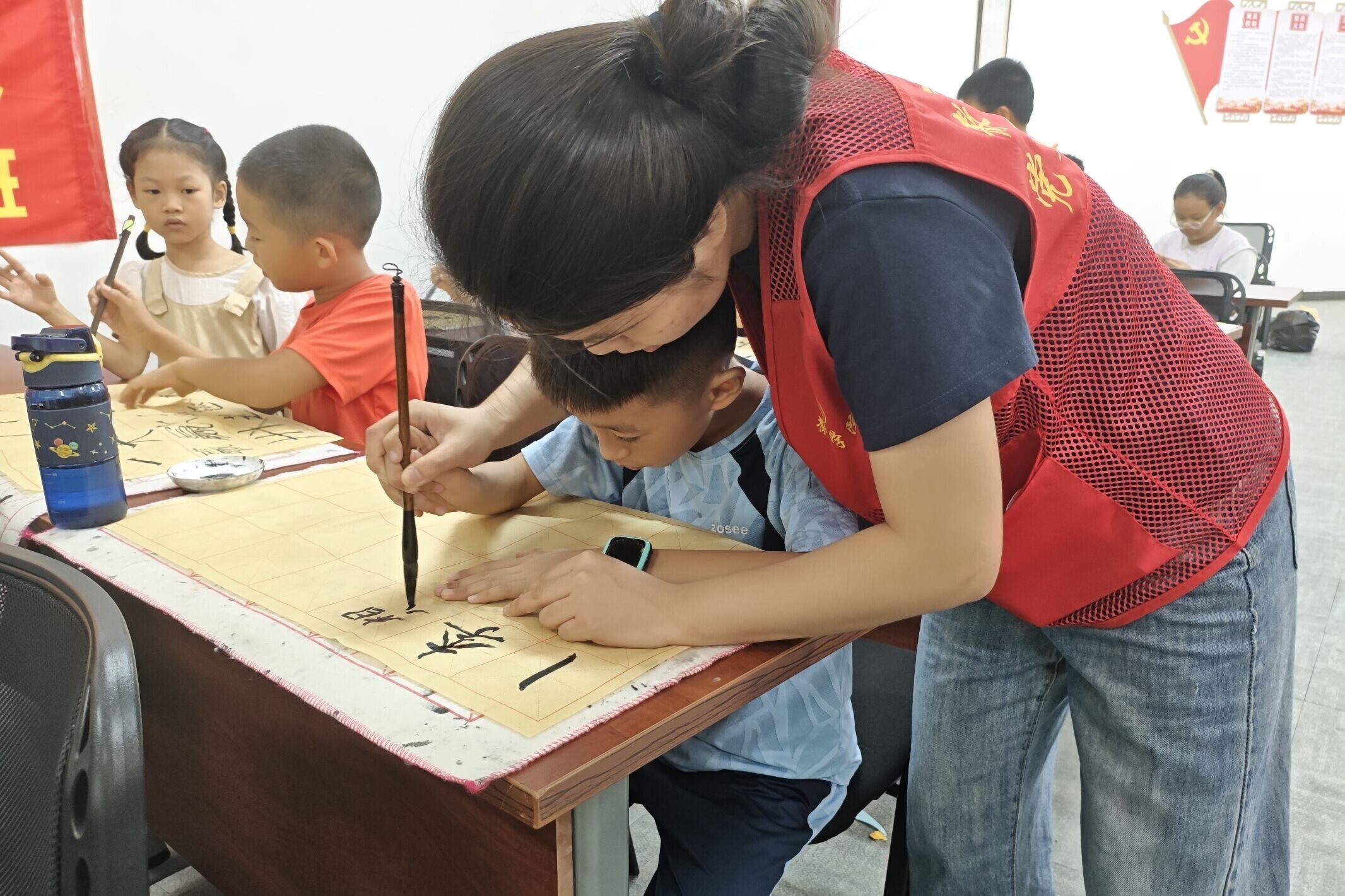 图为实践团成员指导石油社区的小学生写毛笔字。闫雪欣 供图