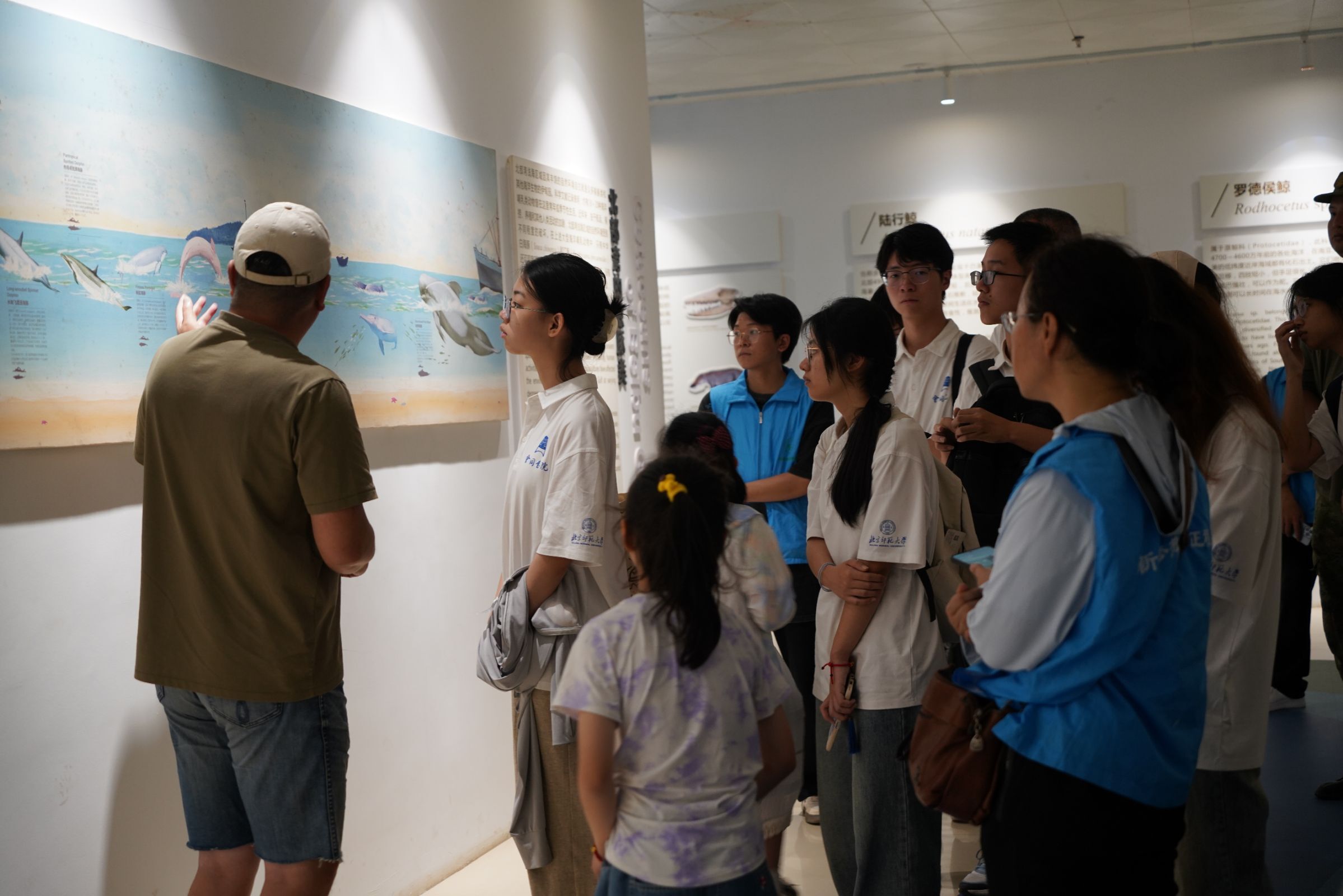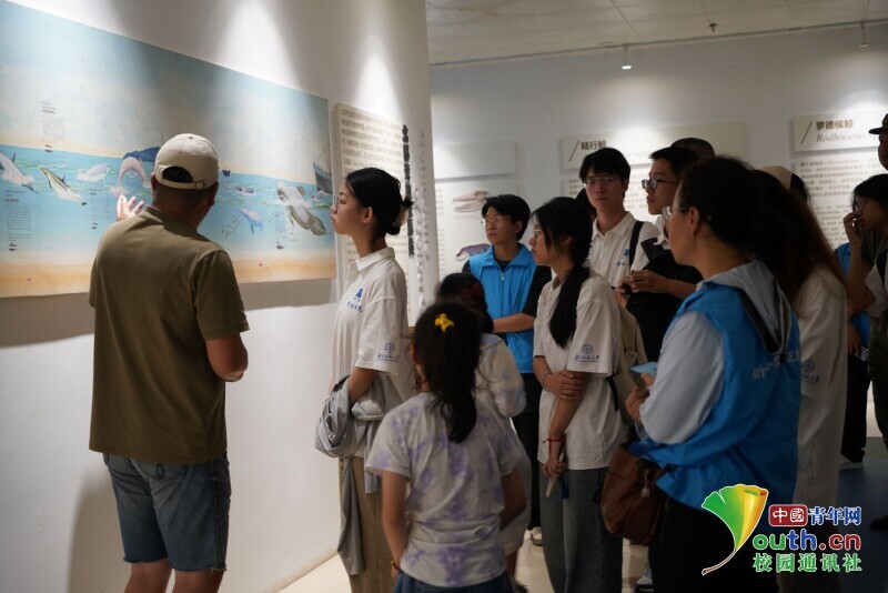 在三娘湾白海豚科普馆,有幸遇到北京大学赵一研究员——中华白海豚研究专家,实践团成员与北师大实践团队一起聆听了专家讲座。研究员向实践团成员介绍了三娘湾海域约160头中华白海豚的生存状况,强调其作为海洋生态“晴雨表”的意义——健康的海洋生态是海防安全的重要基础,保护物种与守护海防需全民长期参与。