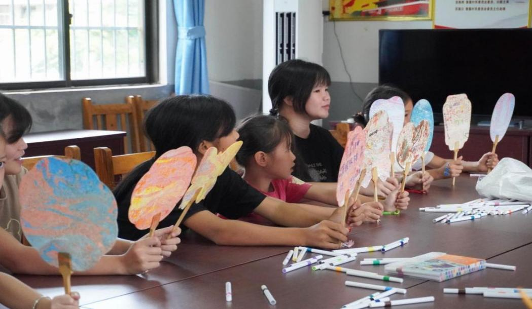 一盆清水,几碟彩漆,当扇骨与水面短暂相遇,古老的漆扇技艺便在刹那间绽放出流动的诗意。在黎屋村村委会议室,面对这仿佛变魔术般的工艺,孩子们眼中充满了跃跃欲试的兴奋。他们屏息凝神,在志愿者的指导下将不同颜色的漆液轻轻滴入水中,看着色彩在水面旋开、交融,形成变幻莫测的纹路。“快看,像彩色的云!”他们看准时机将扇骨浸入水中,手腕灵巧地一转一提,水面流动的斑斓色彩便被“拓印”到了扇骨上。空气中弥漫着大漆特有的气息,混合着孩子们此起彼伏的惊叹。当亲手制作的漆扇最终在掌中轻盈转动,温润的光泽映照着孩子们的笑脸。一把小小的漆扇,让传统技艺通过指尖真实的触感,悄然抵达了童心的深处。