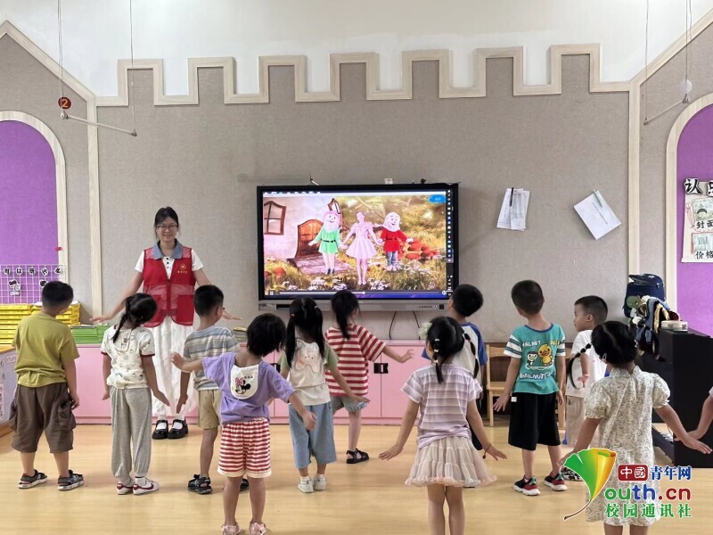 图为服务团志愿者对幼儿园小朋友进行“小小火车,朋友接龙跑”教学过程。周梅 供图