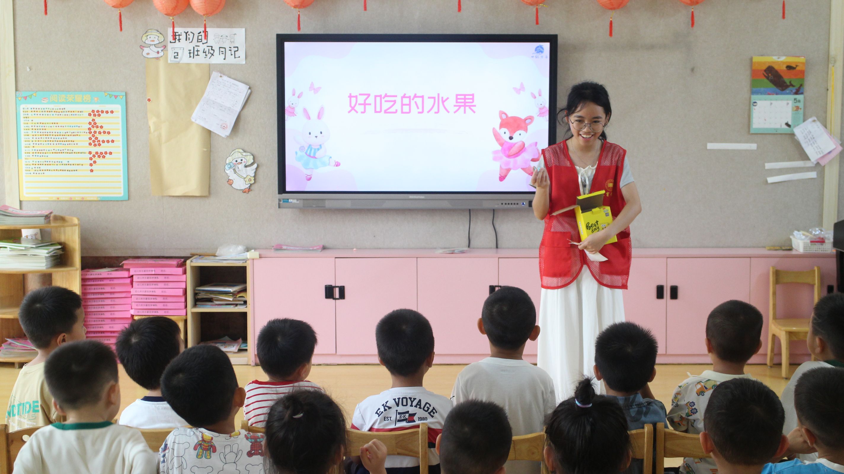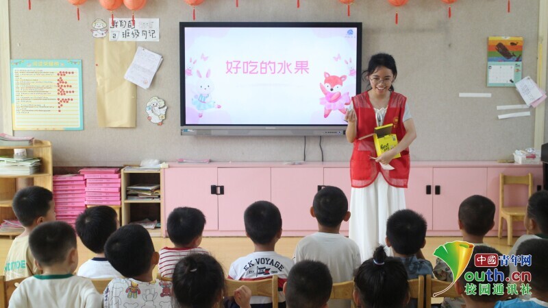 图为服务团志愿者对幼儿园小朋友进行“好吃的水果”教学过程。周梅 供图