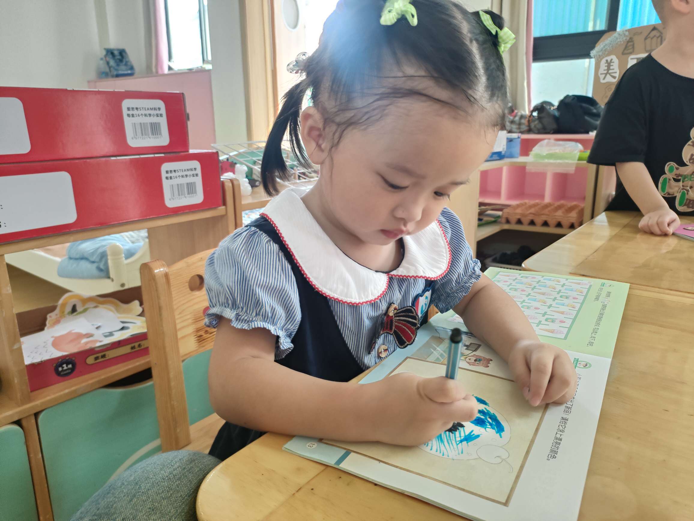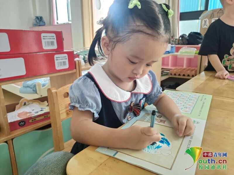 图为幼儿园小朋友在“好吃的水果”课程中给水果图片涂色。周梅 供图