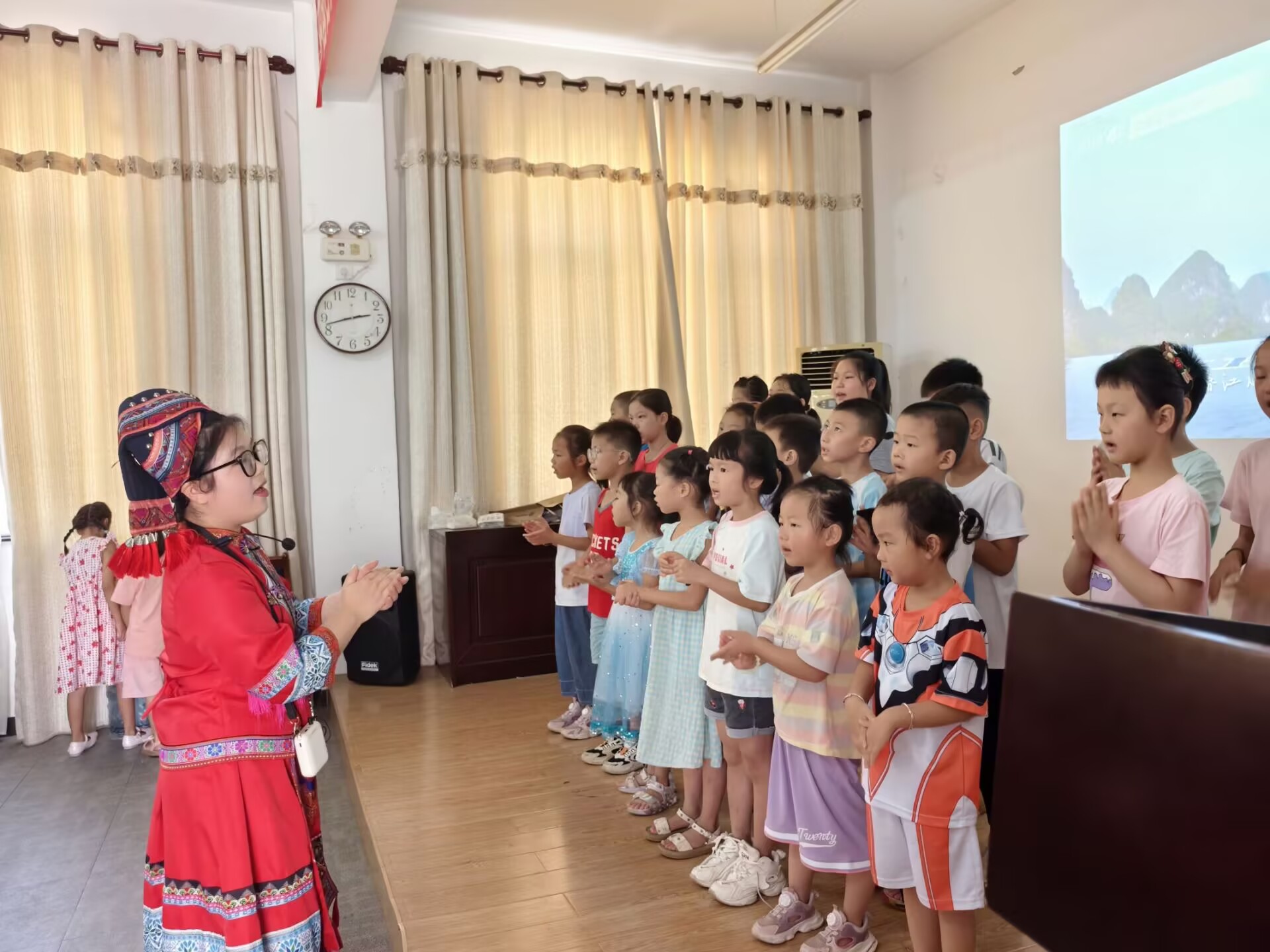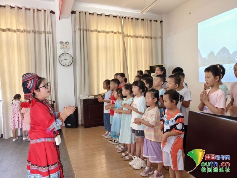 图为服务团志愿者进行“山歌唱乡情,童谣润心田”教学过程。周梅 供图
