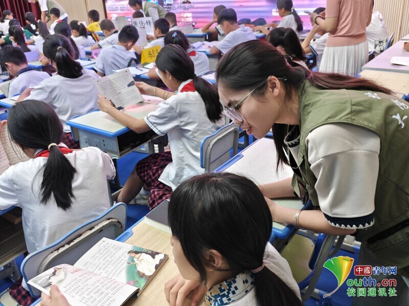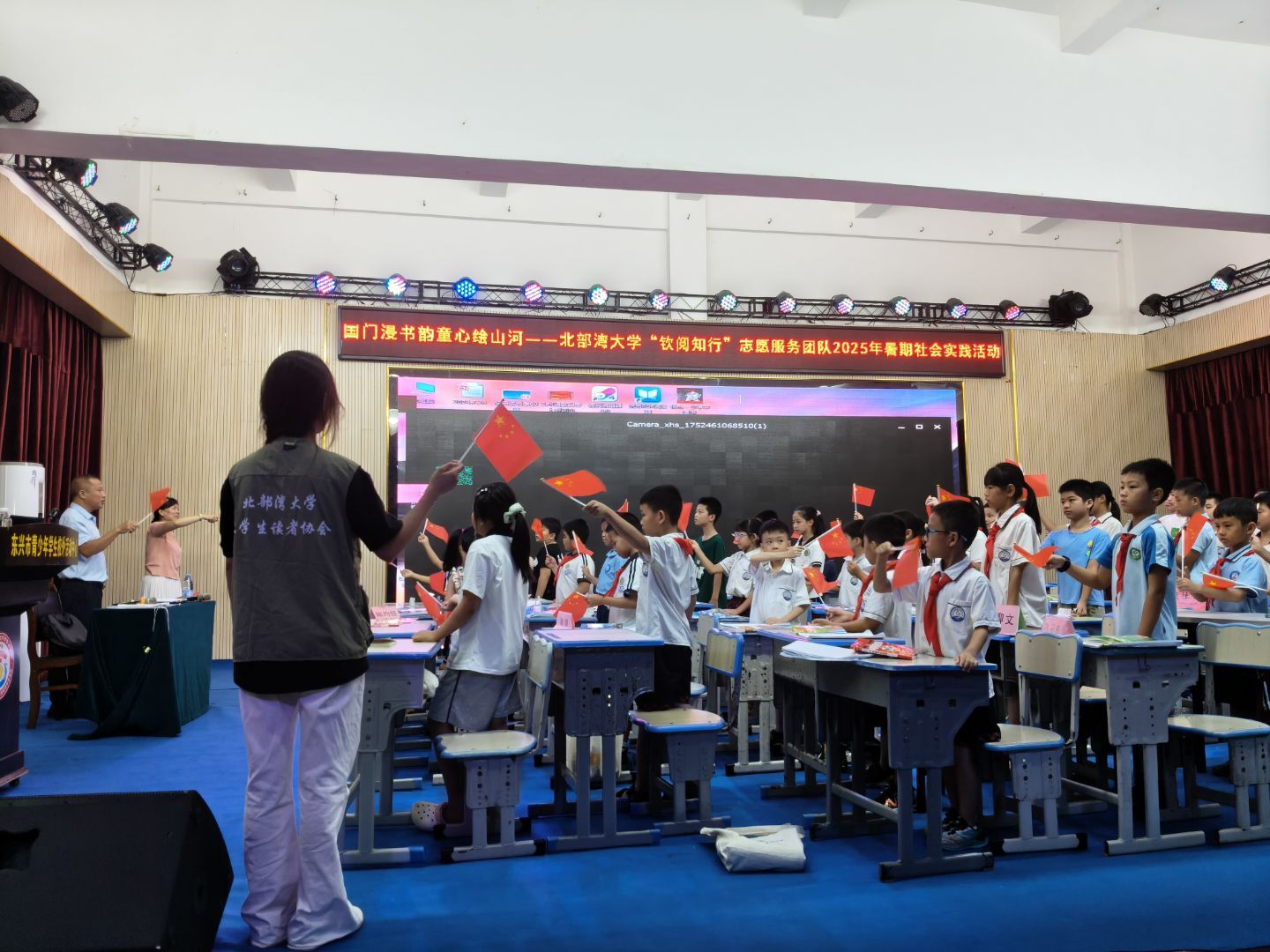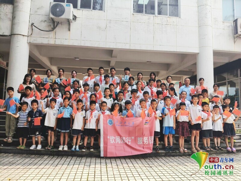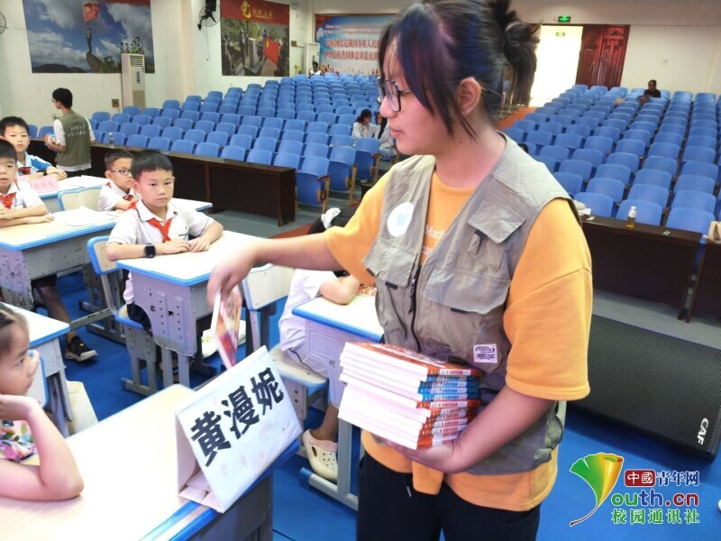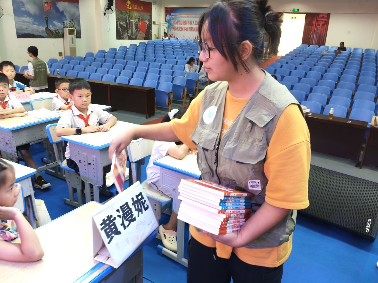 图为“钦阅知行”志愿队队员给学生们分发共读绘本。林玉莹供图
