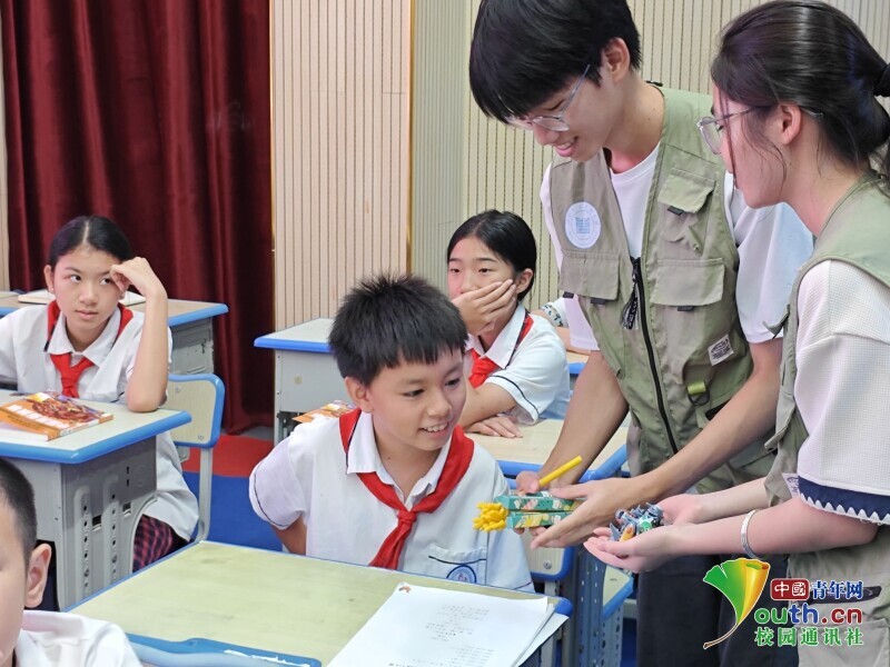 图为志愿者正在为积极参加国家安全知识竞赛的孩子们分发奖品。周情如供图