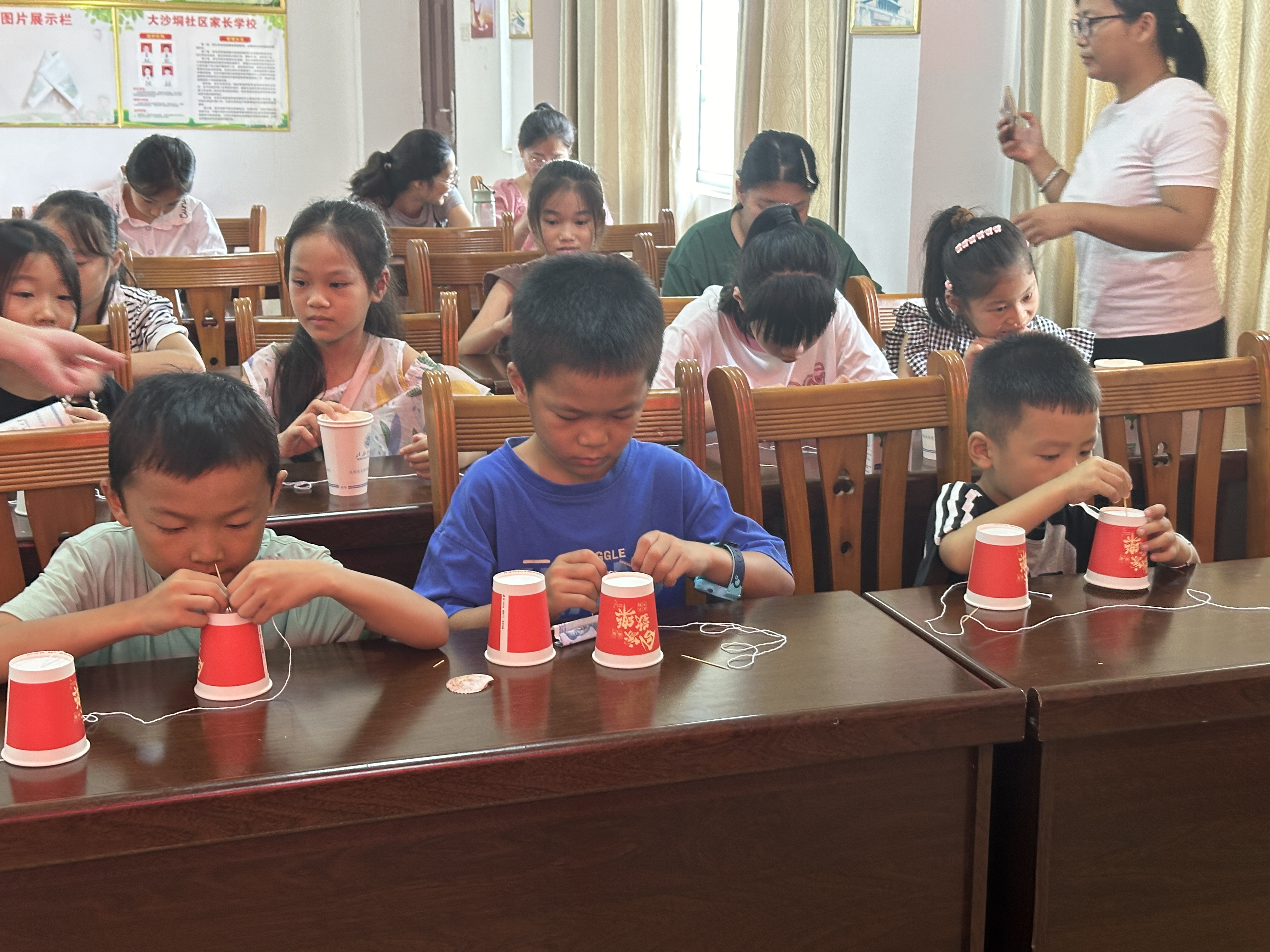 图为小朋友们进行听筒传声的物理小实验。供图 韦思茵