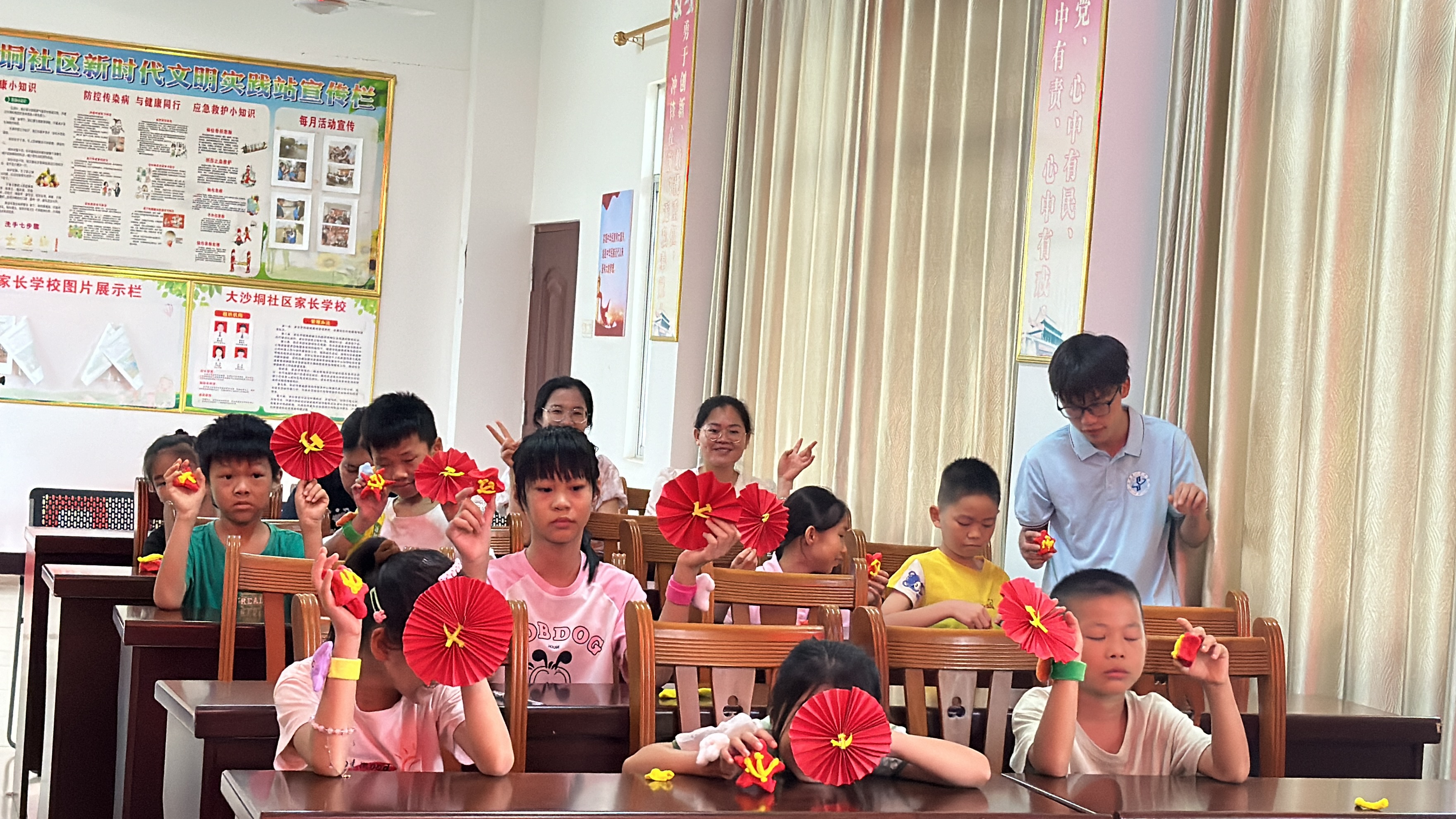图为小朋友们展示自己制作的党徽。供图 韦思茵