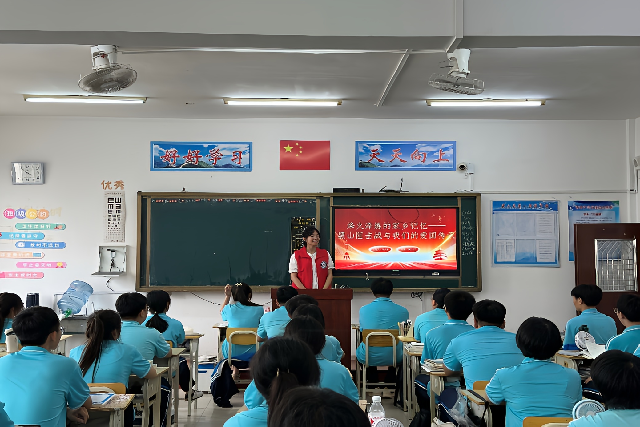 在黑山县第一高级中学,队员李欣格以101高地的照片为切入点,结合在纪念馆看到的弹孔红旗、在高地拾起的弹痕石等亲身经历的素材,向高二学生们生动地讲述了黑山阻击战的红色故事。一张张图片、一件件实物背后的故事,深深吸引了同学们的注意力,让他们对那段历史产生了浓厚的兴趣。