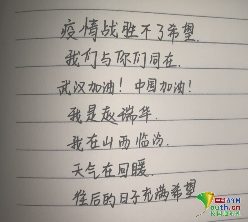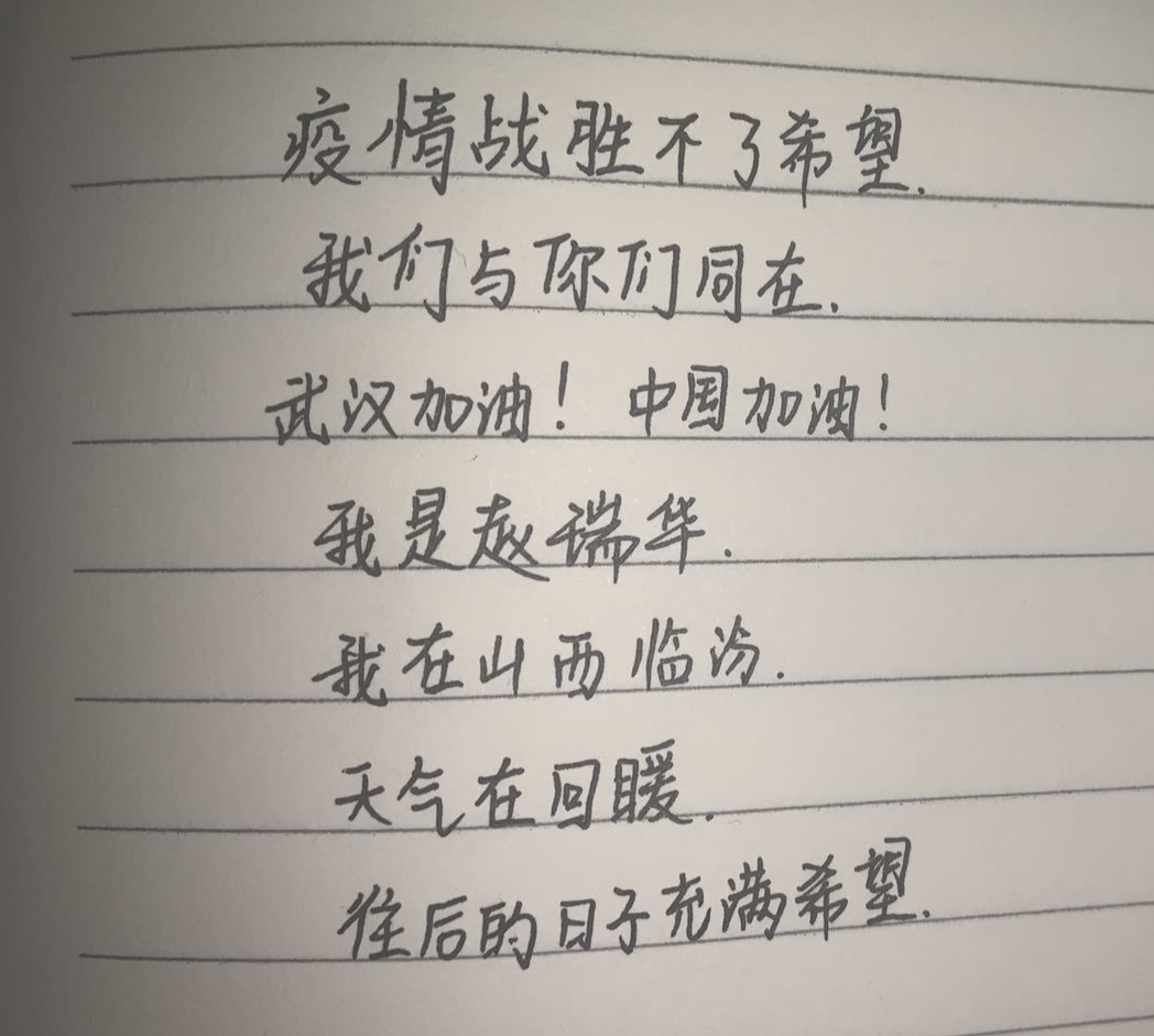 “武汉加油!你们并不孤单,无论顺境逆境,我们始终与你们站在一起。”班级学生潘雅琨得知活动消息后,第一时间参与了进来。“疫情战胜不了希望,我们与你们同在。武汉加油!中国加油!天气在回暖,往后的日子充满希望”赵瑞华写下了自己的祝福。