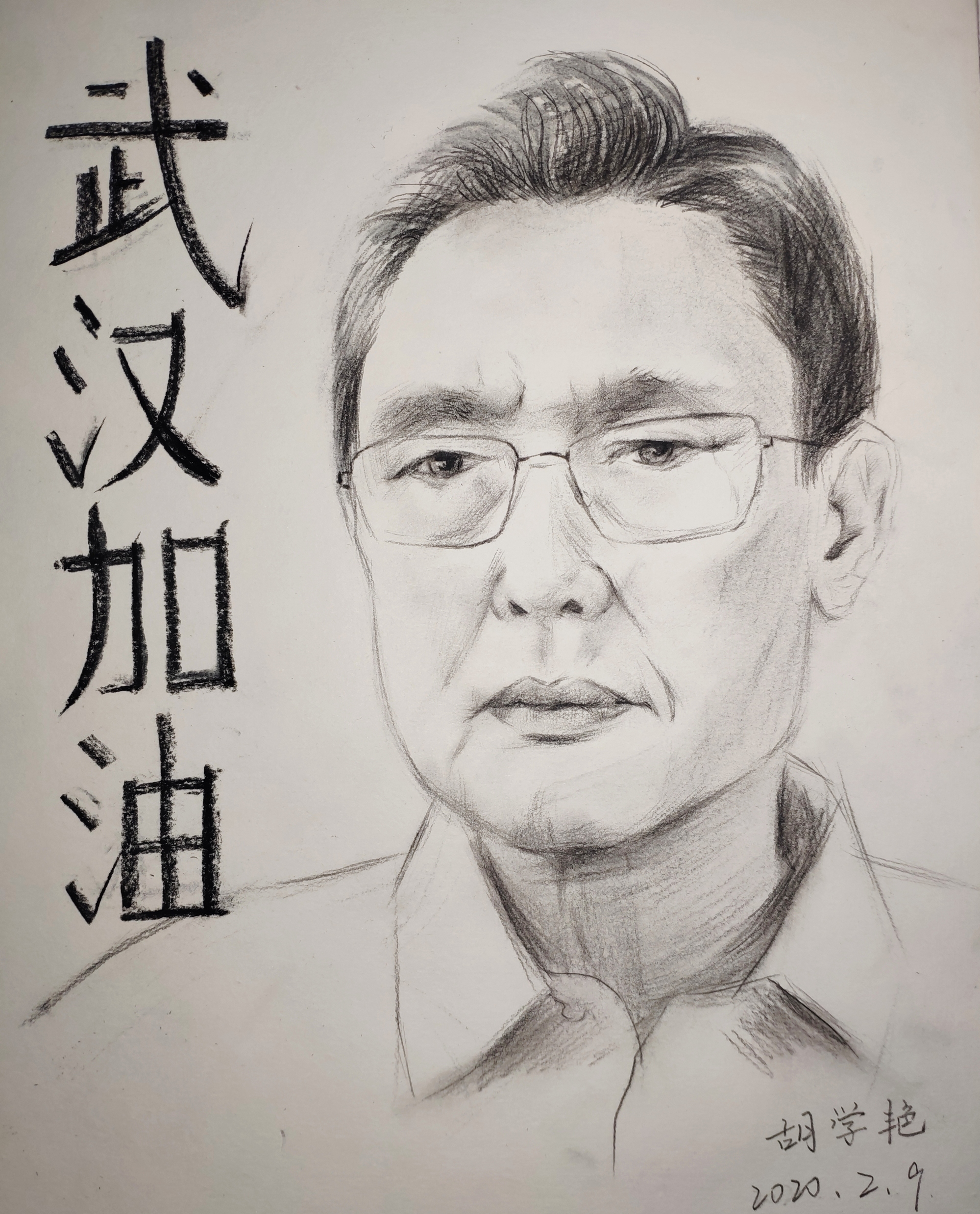 钟南山院士满目担忧地望向远方,旁边有着加粗的四个大字“武汉加油”。原来,这是胡学艳创作的素描画。“这张画是为了向以钟南山院士为代表的一线抗疫英雄致敬。”胡学艳说。