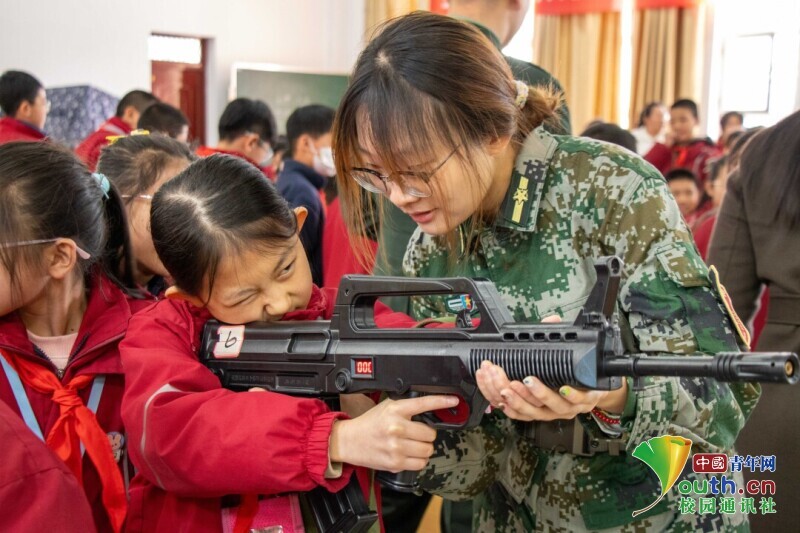 军事知识科普环节,队员蔡嘉伟手持95式激光枪模型,详细讲解枪械构造与战术应用。孩子们围成圆圈,争相提问:“枪的有效射程是多少?”“激光瞄准器有什么优势?”蔡嘉伟耐心解答,现场气氛热烈。活动尾声,副队长胡智昌带领趣味军事游戏,获胜者获得激光打靶体验机会。当孩子们扣动扳机的瞬间,欢呼声与掌声交织成春日里最动人的乐章,更给同学们心中播种下了“献身国防,迷彩青春”的种子。