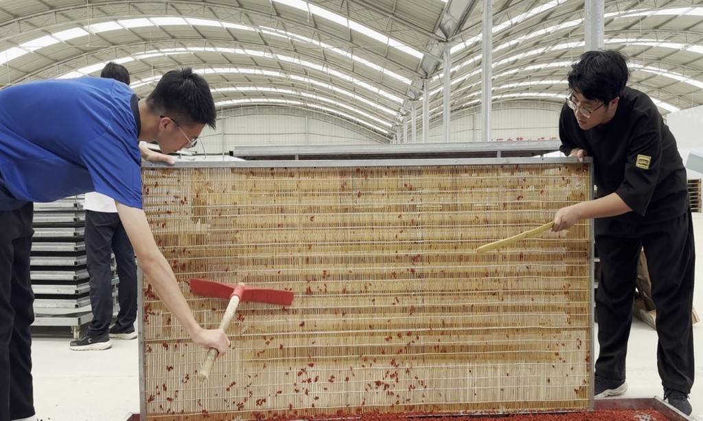 随后实践团前往北滩镇小红沟村调研干枸杞加工生产状况。实践团乘车前往了小红沟村的干枸杞生产厂房。到达目的地后,实践团成员看到两辆运输车正在分别进行卸载鲜枸杞和装载包装好的干枸杞的工作,场内部分工人将以晾晒好的干枸杞从烘干架刮下并装填入袋,工人向成员们介绍该厂干枸杞的两种生产流程:一种是传统经过碱水等步骤进行烘干;第二种是通过低温锁鲜后进行后进行烘干,即冷干制作。由于不同于传统的晾晒,该厂运用机器烘干,所以干枸杞会沾黏在烘干架上,需要人工刮下再装袋。随后工人热情地向实践团成员介绍了刮离干枸杞的技巧,并让实践团成员体验了相关工作。