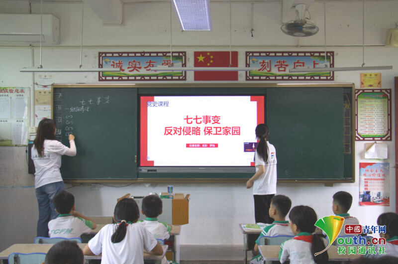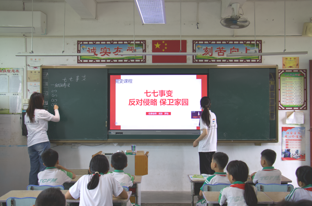 随后,实践团成员为学生们带来了一堂生动的党史学习教育课。课程以“七七事变”为主线,通过历史图片、视频资料和互动问答,还原了1937年7月7日的历史场景。当被问及“七七事变发生的年份”时,学生们齐声回答“1937年”;谈及纪念意义,一名学生坚定表示:“我们要守护现在的和平生活。”课堂气氛热烈,爱国情怀在孩子们心中生根发芽。