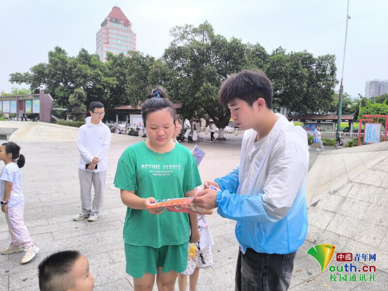 图为实践团成员在南湖公园发放反诈禁毒宣传手册。谢祺毅 供图