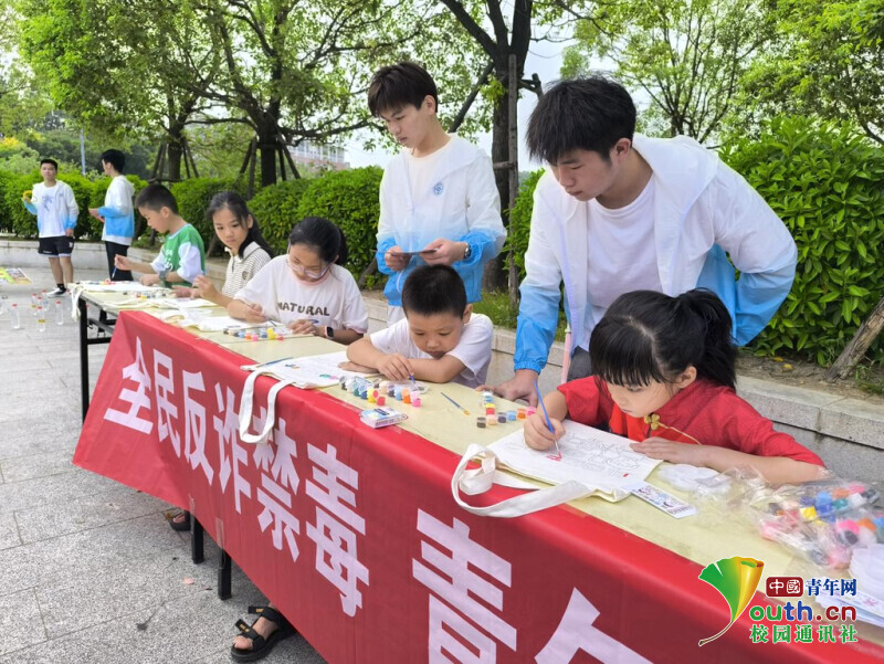 图为实践团成员带领小朋友绘制反诈禁毒帆布袋。袁培桢 供图