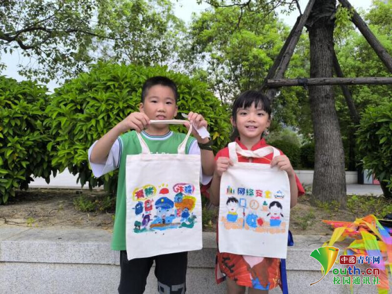 图为小朋友展示他们绘制的反诈禁毒帆布袋。郑云祥 供图
