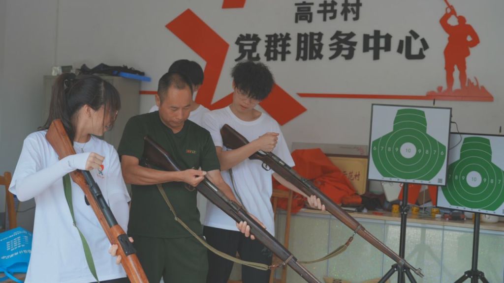 图为在红军近闽第一村展示厅旁的服务中心讲解员教实践队队员如何使用模型步枪,掌握模型步枪的基本操作。陈诗欢 供图
