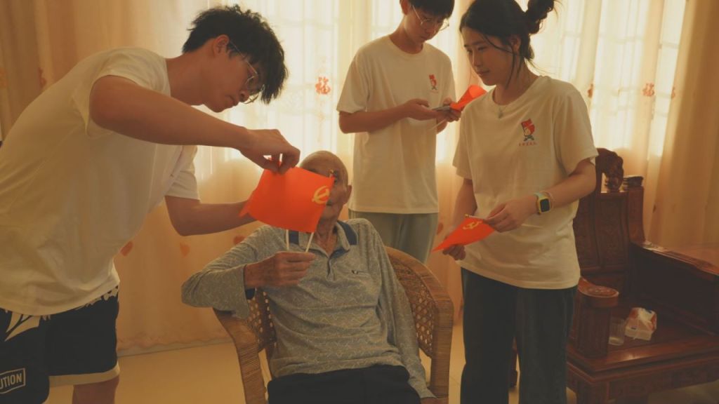 图为实践队队员与“五老”人员之一的老交通员——郑玉坤重温党史。陈诗欢 供图