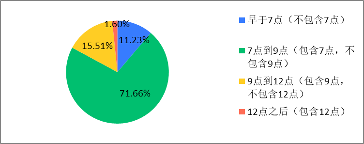 总结:本题的答题人数为187。早于7点(不包含7点)有21人,占比11.23%;7点到9点(包含7点,不包含9点)有134人,占比71.66%;9点到12点(包含9点,不包含12点)有29人,占比15.51%;12点之后(包含12点)有3人,占比1.6%。在187位同学中,大家的主要起床时间集中在7点到9点,这个时间还是不算早也不算晚,说明疫情期间大部分的同学还是没有经常睡懒觉。只有32人的起床时间相对较晚。在家学习,同学们还是比较自律的。