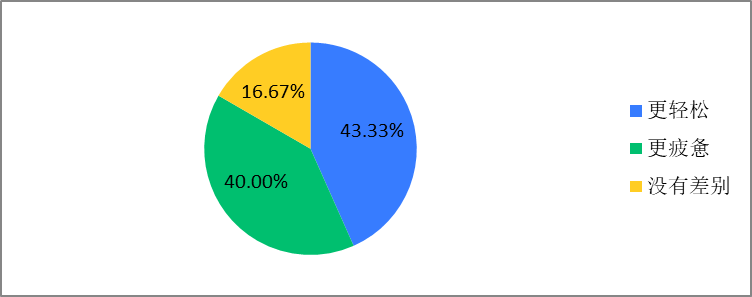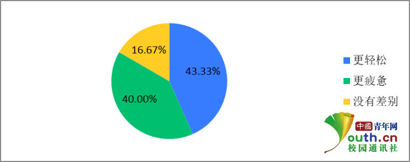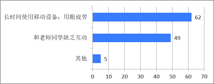 总结:从这张表可以看出不同的学生的感受差别还是挺大的,有43.33%觉得更疲惫和更轻松的占比差别并不大。就我个人的观点来看,觉得更轻松的那部分同学是随时随地可以使用移动设备上课,还可以从网络上获得各种各样的学习资源,而不习惯于课堂的那种约束。其实我觉得线上授课跟翻转课堂有异曲同工之妙。科技时代的进步,课堂也不再是仅仅在几十平米的教室中,更可以通过网络在跟万里外的老师进行交流。而40%的同学觉得更疲惫,一个很大的原因就是长时间的面对着电子设备,久坐者不动。和同学、老师不能面对面交流,这在下一题中会有所体现,这里就不累述了。