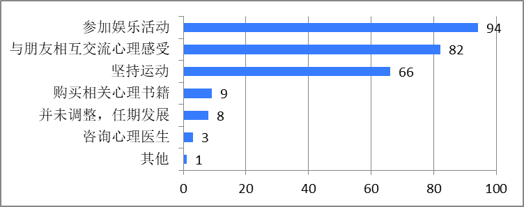 总结:在这道多选题中有7个选项,其中选择参加娱乐活动的有94人,选择与朋友相互交流心理感受的有82人,选择坚持运动的有66人,选择购买相关心理书籍的有9人,选择并未调整的有8人,选择任期发展咨询心理医生的有3人,选择其他(写计划)的有1人。由此可见,娱乐活动是大部分人在有焦虑情绪的时候首选的调节方式;与其相差不大的便是与朋友交流;其次是坚持运动,就我自己而言运动真的对于缓解焦虑情绪有很大的帮助。再次就是看心理书籍,很少一部分同学选择了看心理医生。这种情况下,焦虑情绪应该就是相当严重了。