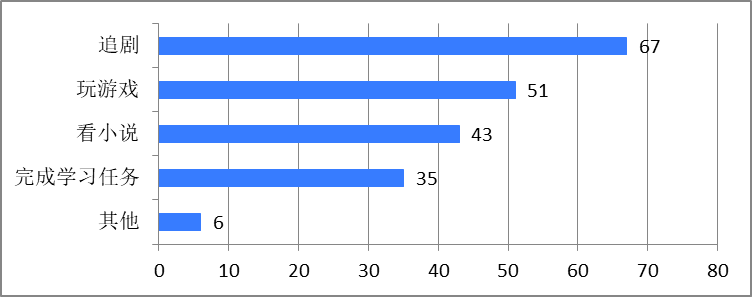 总结:本题是一道多选题,其中选择追剧的有67人;选择玩游戏的有51人;选择看小说的有43人;完成学习任务的有35人;其他的有6人。由于填写问卷的女生有121人并且女生喜欢追剧的程度普遍是高于男生的。所以追剧这一选项是被选率最高的,玩游戏是男女生都喜欢的,只不过多数是男生的热爱度要高于女生。选择完成学习任务的有35人,说明认真学习的同学不在少数,当然也有可能是交作业截止日期快到了所以晚上熬夜恶补。