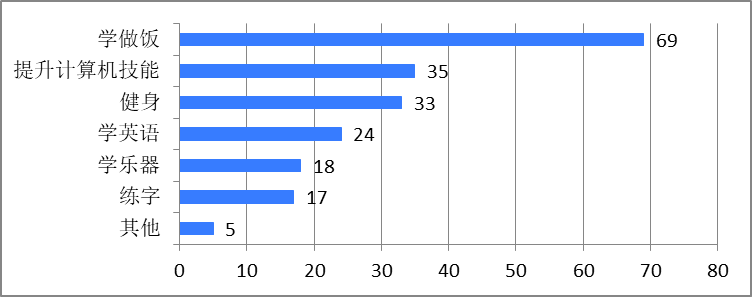 总结:本题中是由上题中选择是的同学来作答,共100人。在是多选题的情况下,选择学做饭的有69人,超过了一半。在疫情期间,经常看到朋友圈里在晒做饭,看来大部分同学也是利用这个机会好好地学习了做饭。选择计算机技能的也有35人,选择健身的有33人,选择学英语的有24人,选择学乐器的有18人,选择练字的有17人,选择其他的有5人。计算机技能也是一个必备技能,上学期因为疫情不能回学校考试,所以只有下学期开学才能考试,刚好借用这个机会好好学习。能够借用这次疫情长时间在家的机会好好学习一些新技能,对我们是很有用处的。