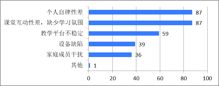 总结:这道题的答题人数是110人,这道题是个多选题,在六个选项当中课堂互动性差,缺少学习氛围和个人自律性差这两者数量是相同的同时也是占比最高的,而设备缺陷、教学平台不稳定、家庭成员干扰、其他这四个选项就略微的低一些。可以看出来,线上授课和线下授课比起来,老师和学生的互动性教学真的效果差一些,而且缺少了课堂上老师的约束,学生的自觉性也变得比较差,所以导致了线上授课的效率偏低。