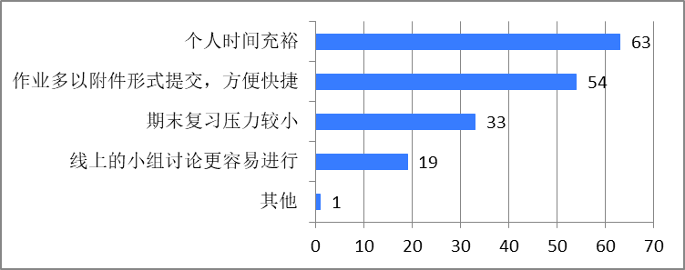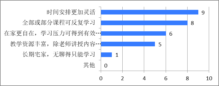 总结:在上一题中选择了更轻松的同学需要回答这道题,在五个选项中并且是在多选的情况下,个人时间充裕是被选择的最多的,而作业多以附件形式提交,方便快捷要稍微低一点,位居第二;期末复习压力较小是第三位;线上的小组讨论更容易进行是第四,其他是最末。这几个选项中我感触最深的就是线上的小组讨论更容易进行,以前在学校每次讨论问题都要群员集合去食堂或者是教室,但是线上的话就不用纠结于在哪里见面、讨论了。