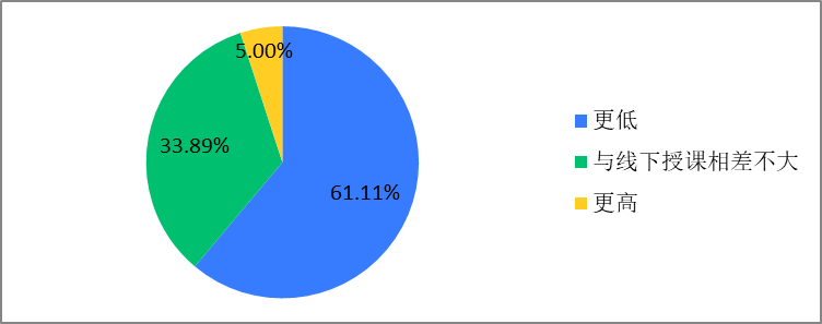 总结:在开展线上授课的学校中,有61.11%的学生认为学习效率要比线下授课效率更低,而又33.89%的同学认为两种方式几乎不影响效率,只有5%的学生认为效率会更高。线下授课在学生的心目中还是有不可估量的地位的。课堂学习这么多年,突然一下子就变成了线上教学,没有了那种实物的感觉,而只能隔着屏幕说话,让学生觉得很不习惯。自然效率就变得差了。