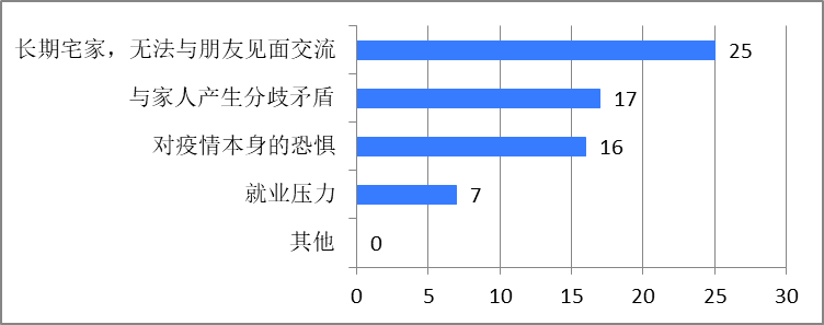 总结:在上一题中选择了生活问题的同学需要回答本道多选题题,回答人数是39人。在这五个选项中,选择对疫情本身的恐惧的有16人,;选择长期宅家,无法与朋友见面交流的有25人;与家人产生分歧矛盾有17人;就业压力有7人,说明大部分学生因为长期待在家里无法与朋友见面而对情绪产生了较大的影响。这次的疫情是我们自从记忆以来记忆最为深刻的一次疫情,也许在非典发生的时候我们还太小所以没什么印象,但是这次的疫情却是让每个人刻骨铭心的。所以情绪因为疫情而有所印象也是大部分同学都经历过的。因为本次问卷回答的年级主要集中在大二,就业问题对于大二的同学来说,还不是特别重视的事情。因为疫情和家人长期待在一起避免不了会产生矛盾,从而情绪也会受到影响,这个选项选择的同学不在少数。