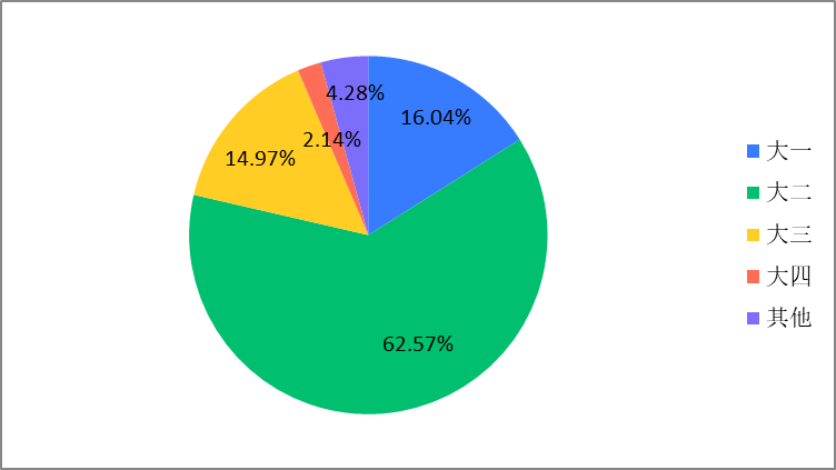总结:本次被调查高校学子主要来自于大二年级,大二年级学子占总人数的62.57%。