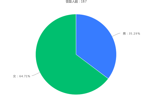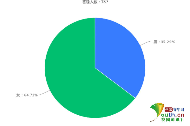 总结:本次被调查高校学子共计187人,其中男生占35.29%,女生占64.71%。