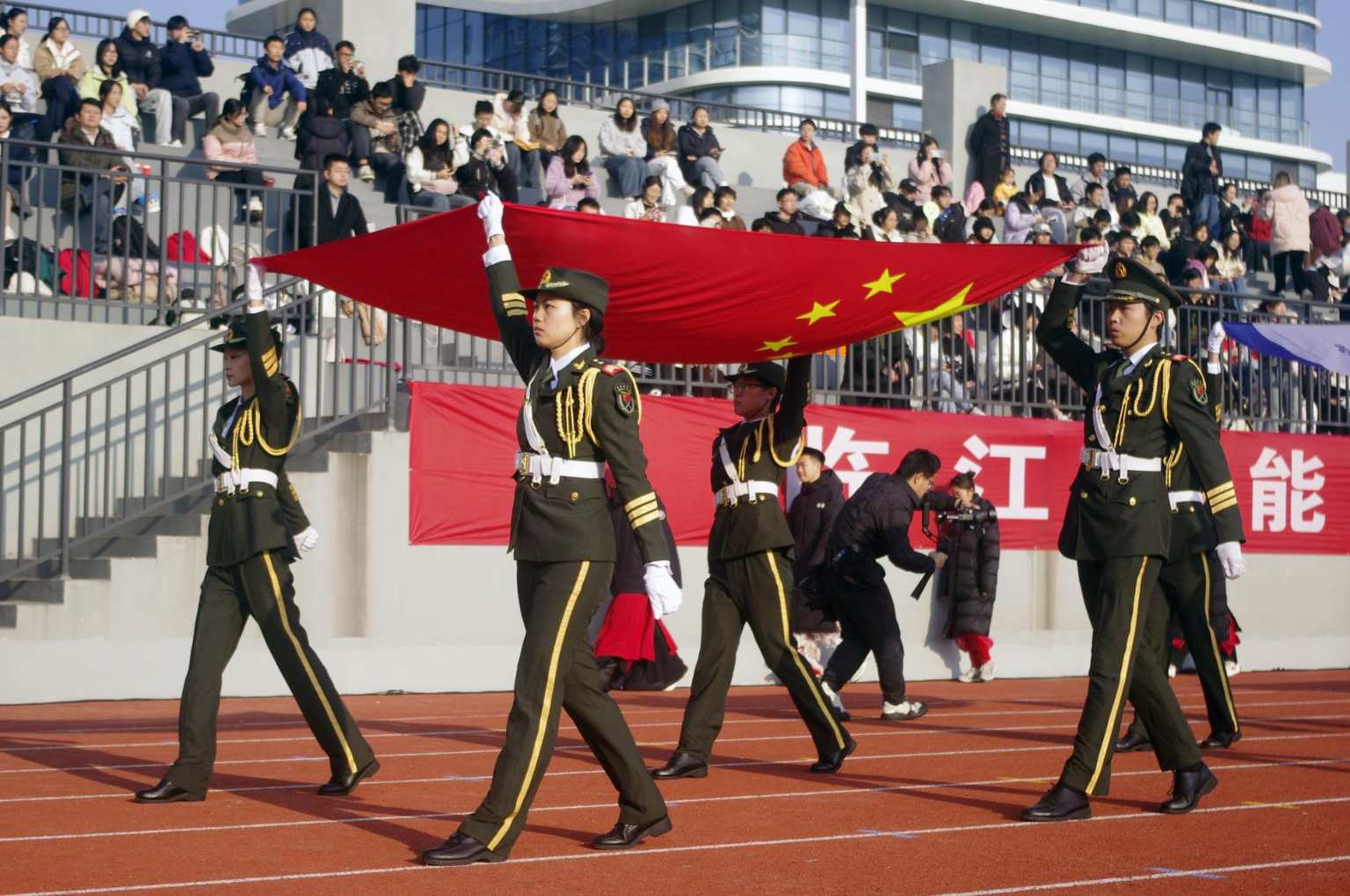 图为运动会开幕式上女子升旗队在国歌声中迈步向前。许诺 供图