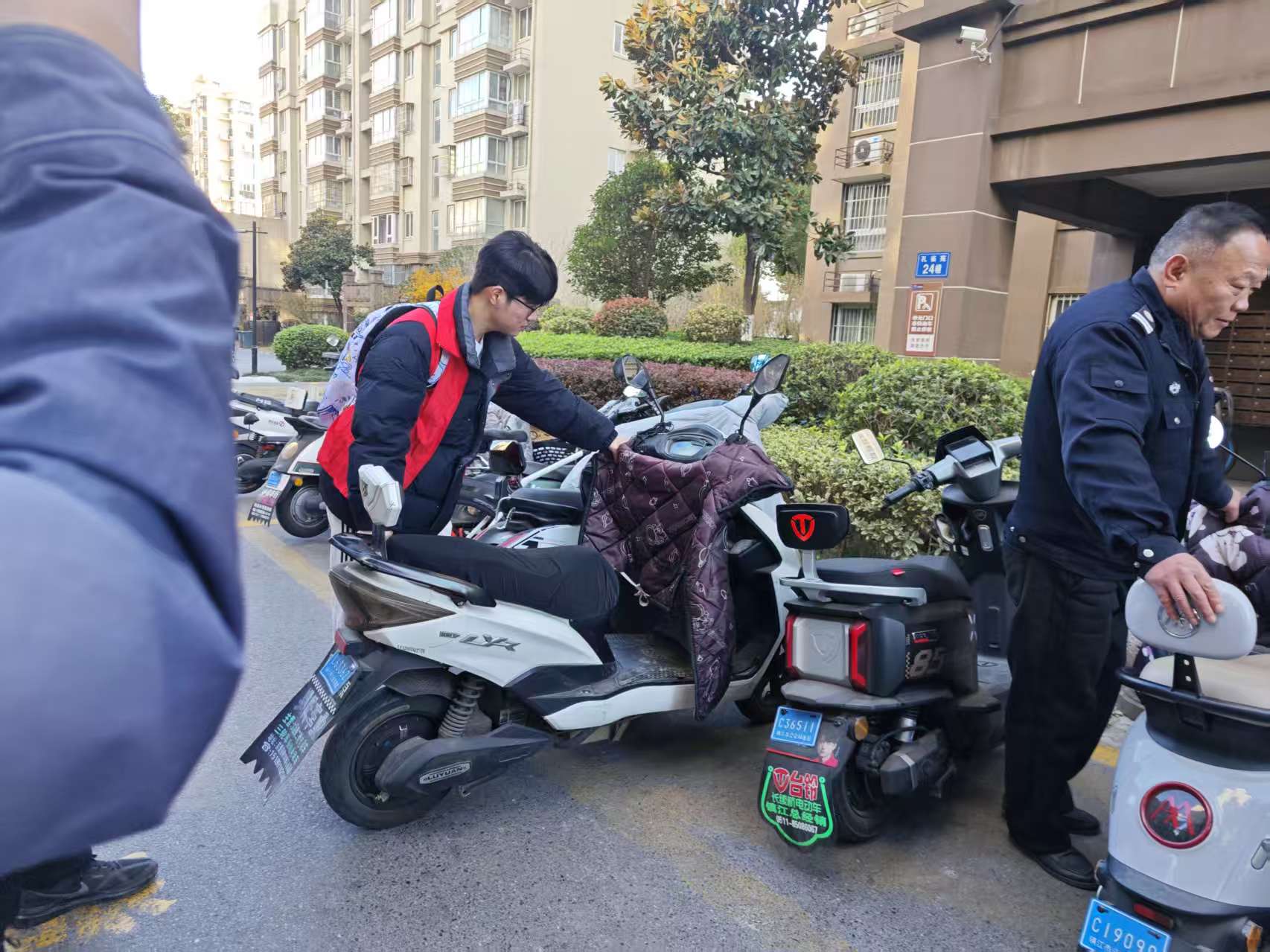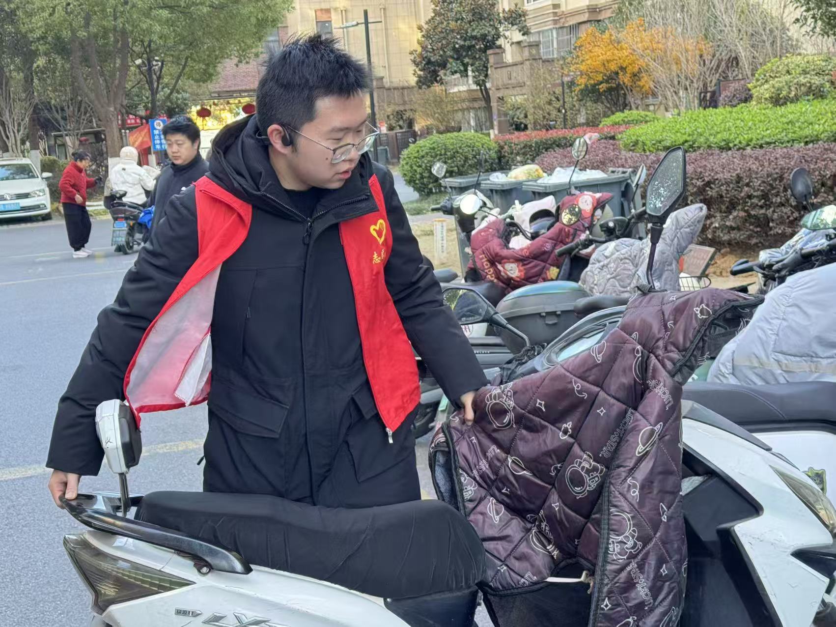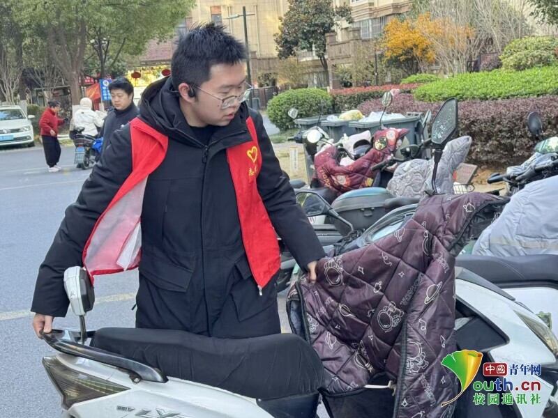 图为志愿者帮助居民清除电动车消防安全隐患。于涵 供图