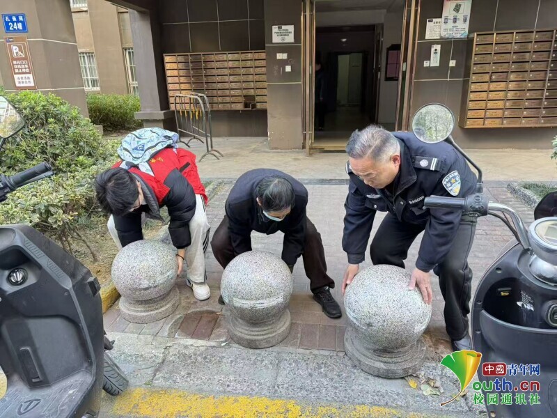 图为志愿者帮助物业摆放禁止电动车入户的路障。于雅静 供图