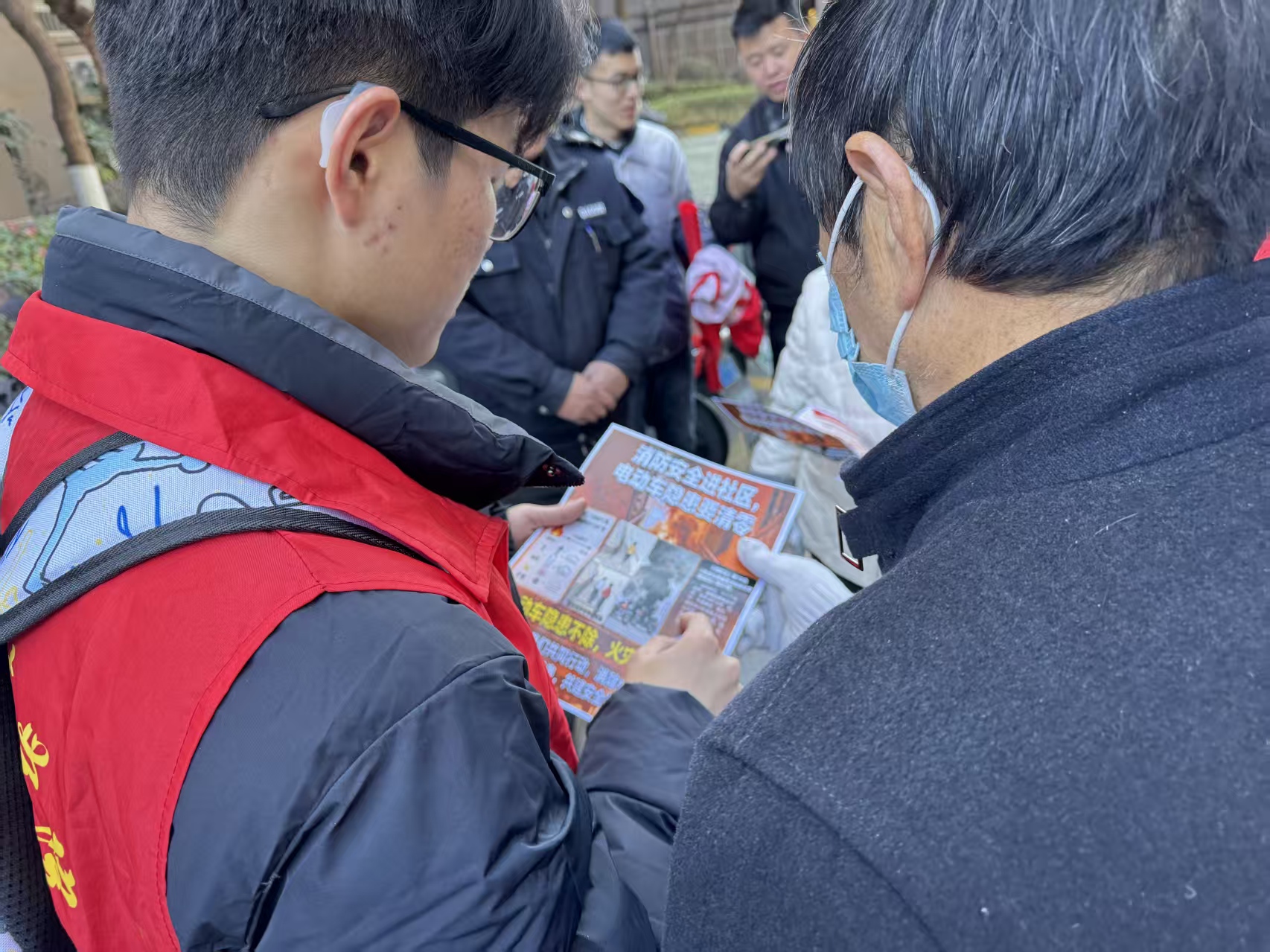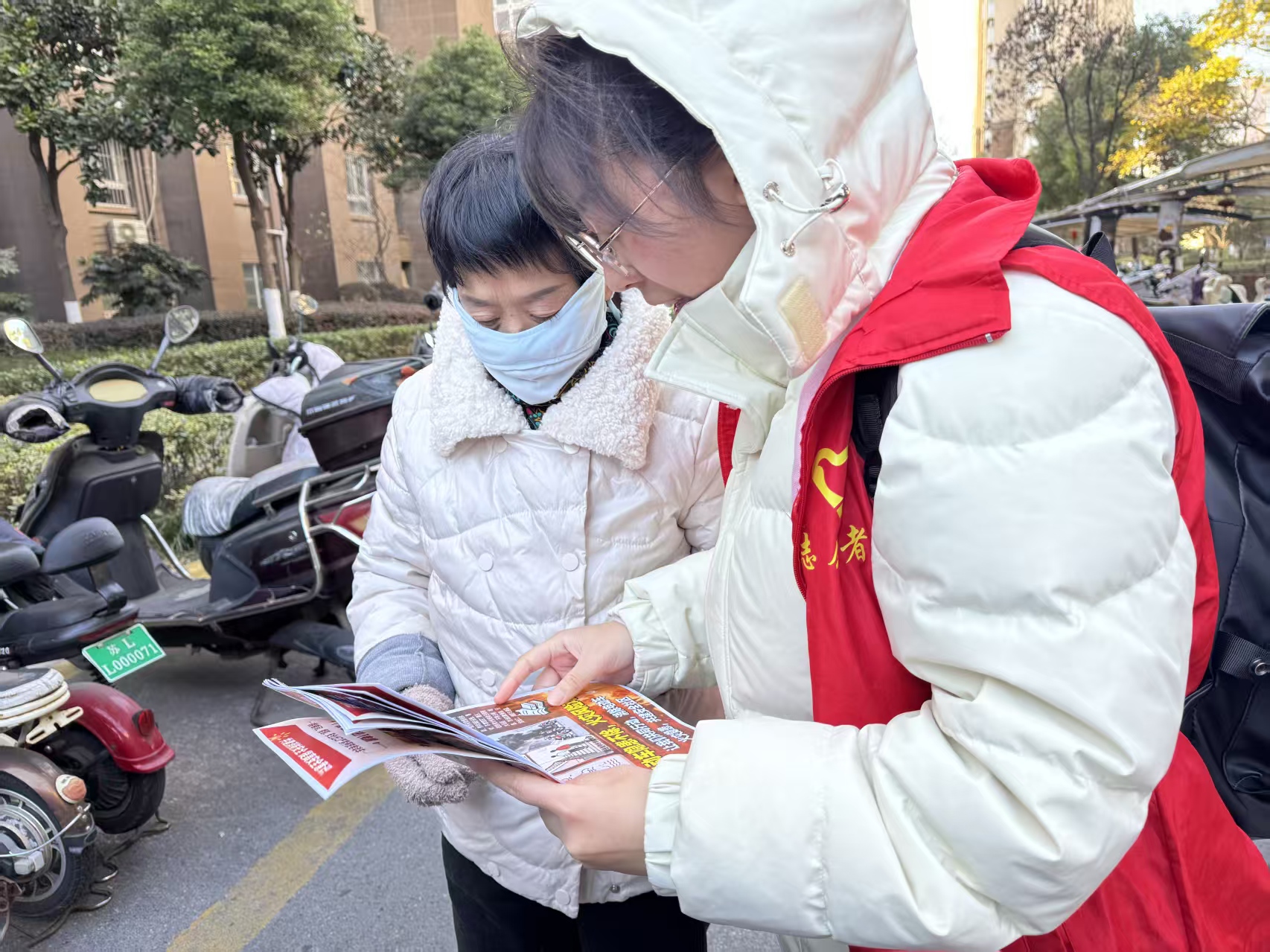 图为居民与志愿者交流电动车消防安全事件。于涵 供图